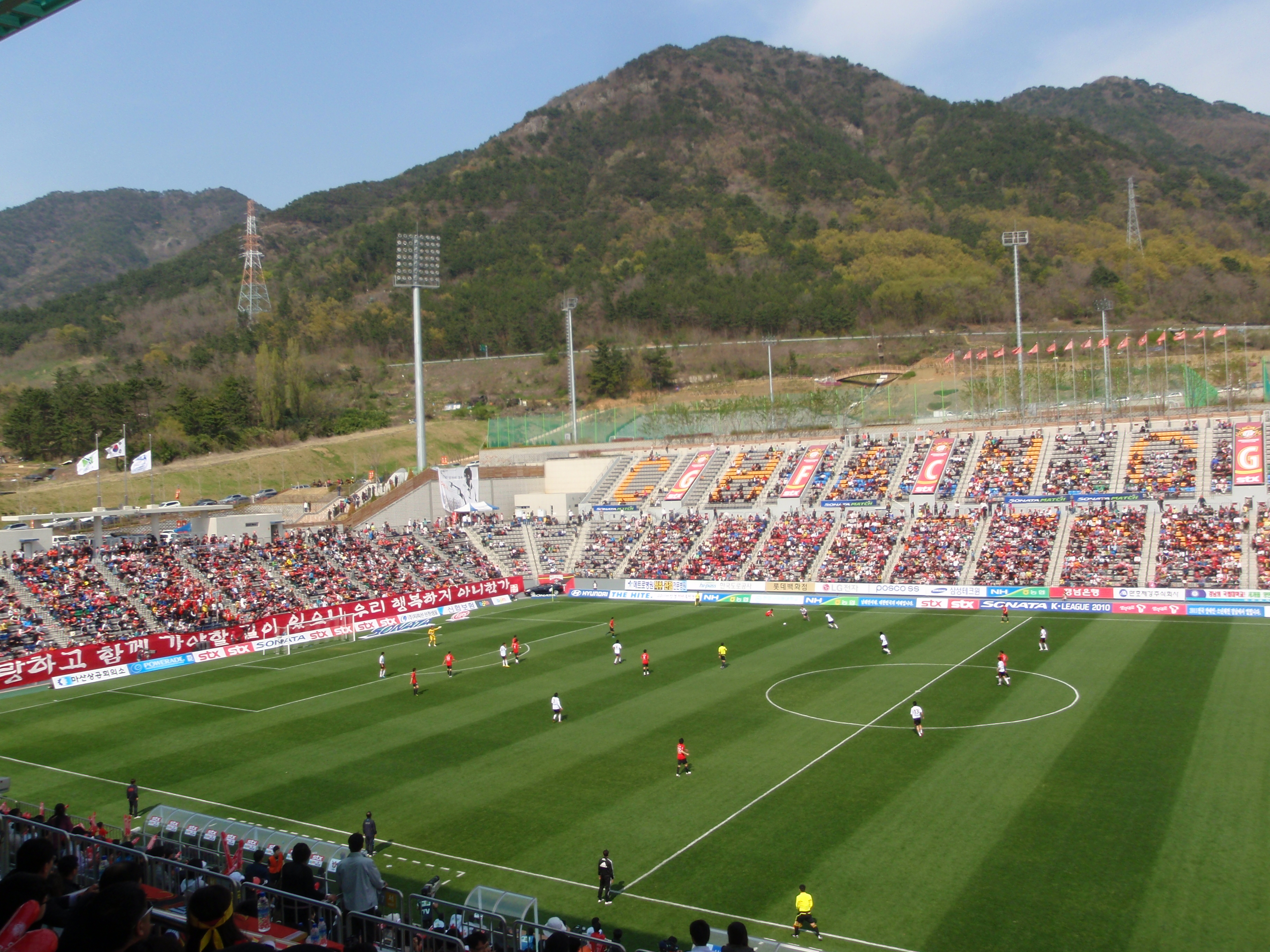 The ground looked pretty smart from the outside and was decorated with a lot of banners in the Gyeongnam colours of red and black. It was only built last year and holds 15,500 people, perfect for a club of Gyeongnam’s size. I walked along the front of the stadium and then up behind the goal where I bought a ticket. I’m used to the odd surprise at these ticket offices but today’s was one of the best yet. I handed over the exact money for a 10,000 won ticket and in return got not only my ticket but a 6” square pizza box with a slice of pepperoni pizza in it. I took my snack, declined the offer of a couple of those inflatable sticks to bang together and went into the ground. You could sit anywhere at all, so I decided to sit in the shade. It was a hot day and I’ve been finding recently that my severe new haircut doesn’t give my scalp much protection from the sun. Mind you, I don’t get compared to Meat Loaf any more, so I’m not going to complain about trivial stuff in comparison. Second degree burns seem a lot more preferable to some smirking twat whistling ‘I’d do anything for love’ behind your back.