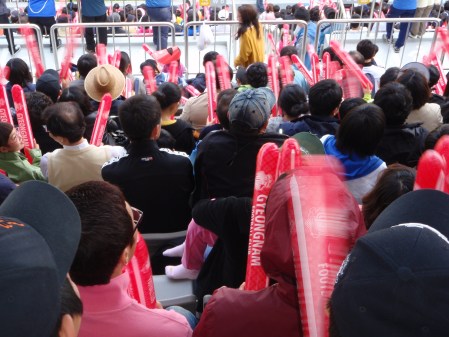 As the game kicked off there were a lot of people outside, perhaps being held up by the need for more pizzas. In fact, twenty five minutes into the match there were still people making their way in. This was probably the closest to capacity that I’d seen any ground in my time here, but I suppose that shouldn’t be much of a surprise, given that Gyeongnam, in second place, were playing the league leaders, Seoul. Gyeongnam were in red shirts and black shorts whilst Seoul, who usually wear AC Milan style red and black stripes were in white shirts with a diagonal red and black stripe and black shorts.