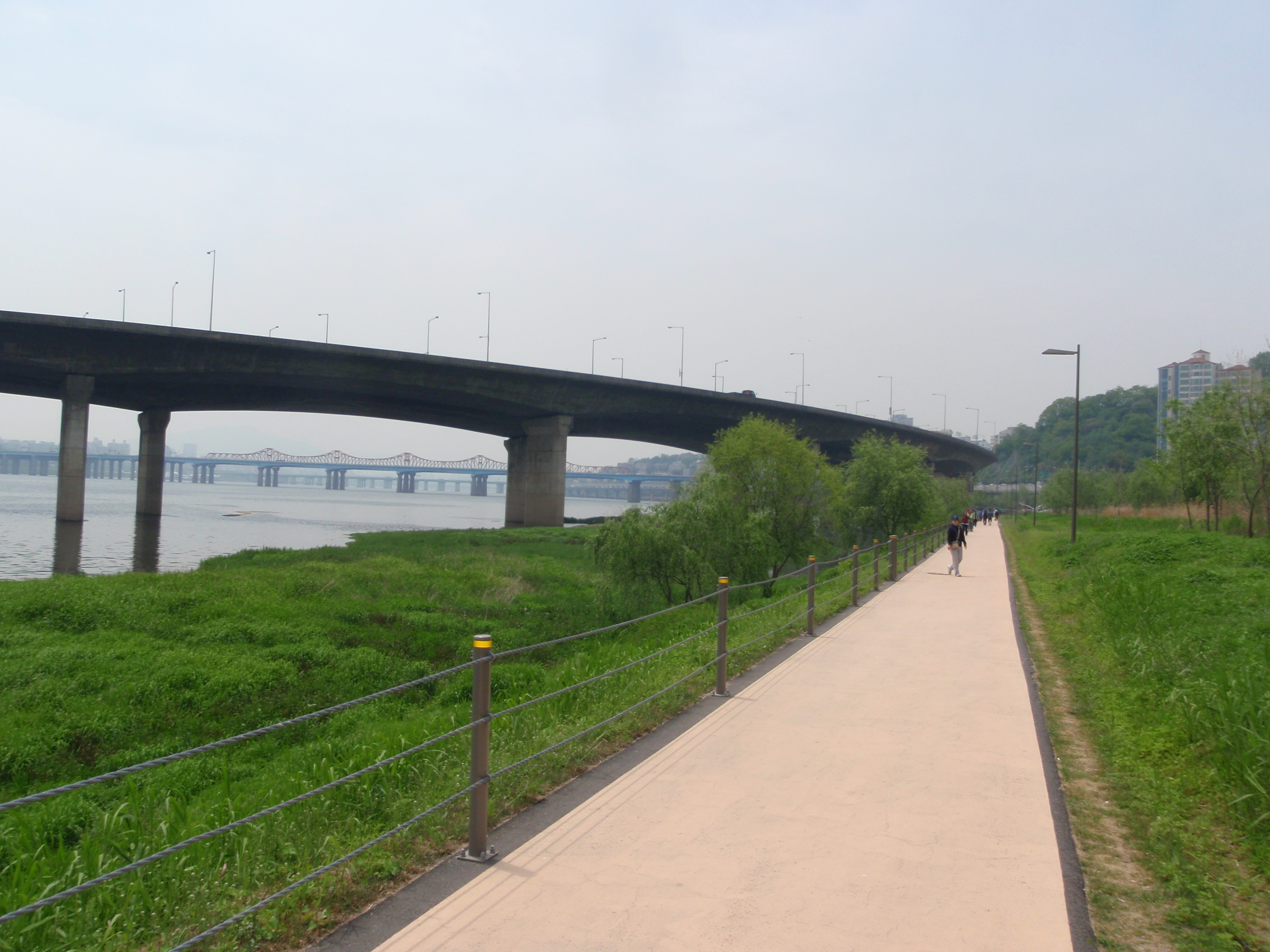 Saturdays have developed into hiking days, with a regular group of walkers. This week’s walk was due to start from Hoeryong and was a fair distance by subway from my apartment. Fortunately we weren’t due to meet up until 12.30pm which allowed my hangover to settle a little. I set off just before eleven and after some poor choices of subway line and some unusually long waits for trains, at noon I was still a change of line and seventeen stops away from the meeting place. They would no doubt have waited for me if I’d asked, but I didn’t want to be selfish and so phoned ahead to let them know that I wouldn’t be able to join them this week. As I had my hiking boots on I thought I might as well have a bit of a walk anyway and got off the train at the next station. It was Eungbong, over to the east of the city and just north of the Han River that runs through Seoul. As there was a path alongside the river I decided just to follow it until I got bored. It was quite an interesting walk. There wasn’t much happening on the river itself, a little bit of dragon boat training and the odd jet ski, a few fishermen, generally with four or five rods each, but every few hundred yards there would be permanent outdoor gym equipment, basketball courts, five a side pitches and badminton nets. I even passed a croquet pitch where a few pensioners were having a quite fiercely contested game. It was all free to use and seemed well taken care of and very popular. A cycle path ran alongside the path I was walking along and was also very popular with a mix of cyclists ranging from those on top of the range bikes and kitted out as if they were setting off to the Tour de France, to students on hired tandems and families with small children on bikes with stabilizers.