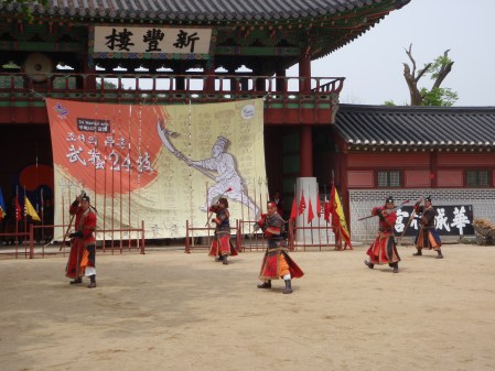 First though, I wanted something to eat. I stopped at a little café and had some pork dumplings. They were very nice, although as they had been deep fried I suspect that they probably weren’t too good for me. When I came out of the café I followed a sign for a palace, thinking that it would be something to do with the fortress wall. It wasn’t really, but there was a display of people dressed up in period costume, although which period I’d no idea, waving swords and sticks about. I watched them for a while and then conscious that I’d a wall to get around before the match I thought I’d better let them get on with cracking each others skulls and left them to it.