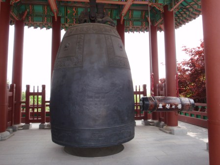 Every hundred yards or so was a gatehouse or a temple, all with helpful explanations in English. A bit further around was a great big bell that you could ring for a thousand won. You hit it with what looked like a railway sleeper on a couple of ropes and you got three goes. The first was meant to signify gratitude and respect for your parents, the second was for the health of your family and the third one was to bring about the realisation of your dreams. Well, I don’t have too many dreams, not if you exclude the recurring one with Konnie Huq and the baby oil, but I was happy to toll the bell in honour of my parents and the health of my family.