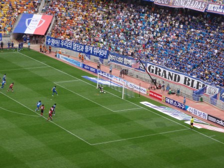It was a decent sized crowd, with my stand being virtually full and with a lot of noise from the Suwon fans behind the goal to my right. It was goalless at half time and the best chance of the second half fell to Suwon’s Brazilian substitute Juninho. Yes really, but not him, and not the one who used to play for Lyon and who possibly still does either. There must be a Juninho factory somewhere. Brazil I imagine. That would be the sensible place to have it. Anyway, I was hoping that the crowd might sing his song, so I could join in for old time’s sake. Any chance of that disappeared though when he hit a penalty straight at the keeper.