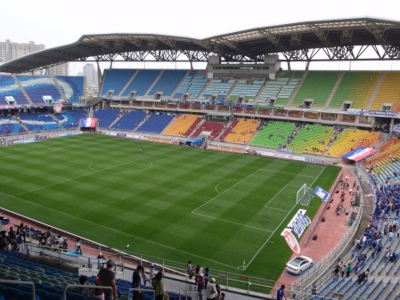 I’d spotted the Bluewings stadium from one of the higher points of the fortress and when I’d got about three quarters of the way around it was time to leave the wall and head for the stadium. It had been built for the 2002 World Cup and had a very distinctive roof, shaped to resemble a pair of wings. I bought a ticket for the East stand for 12,000 won, mainly so that I could get a good view of the winged roof opposite. There were no free pizzas this week, but we did all get given a banana on the way in instead.