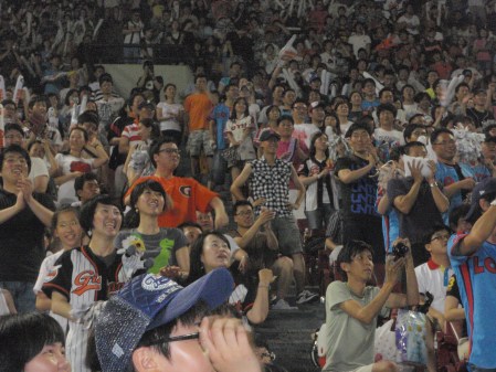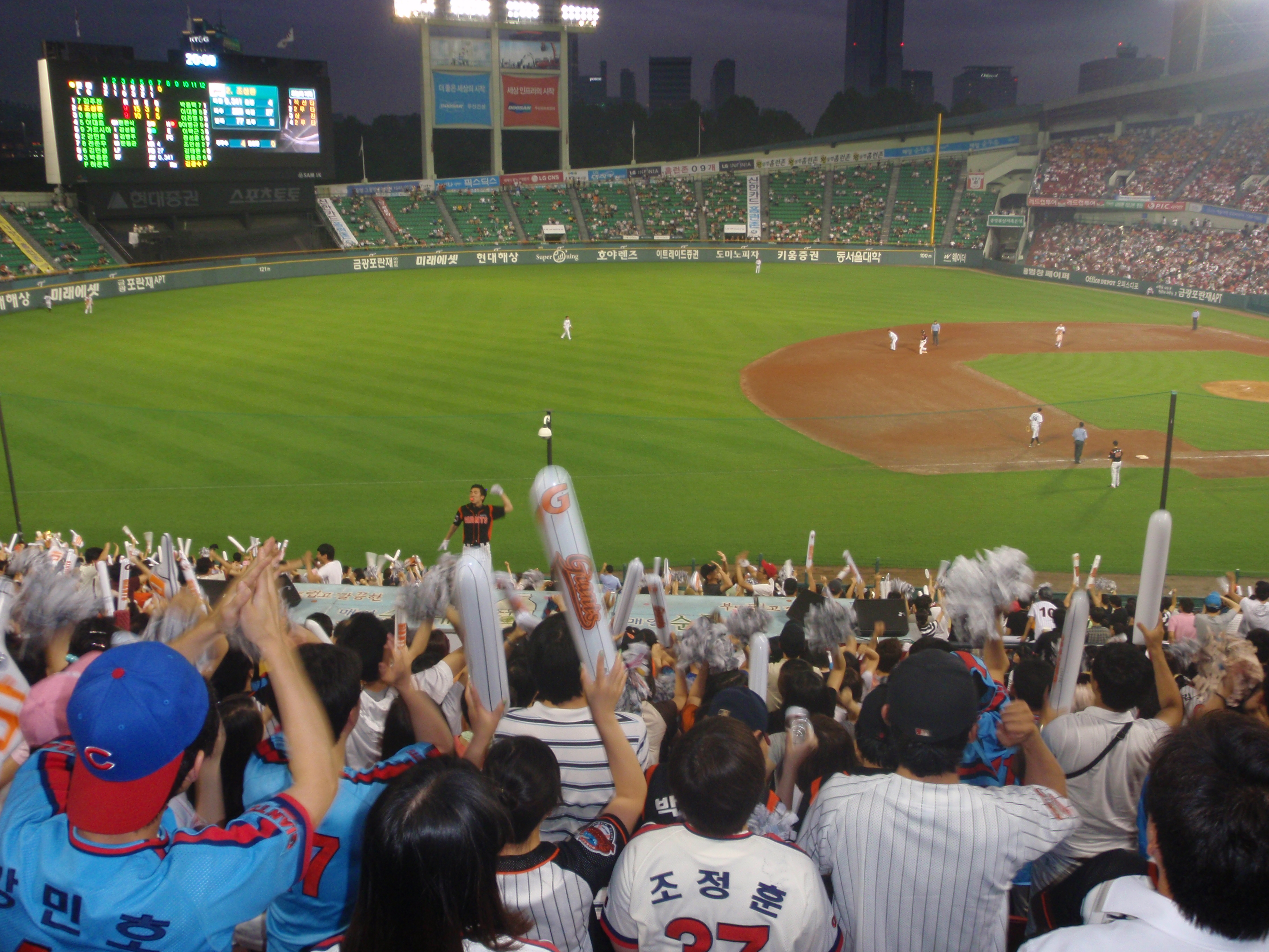 I got a six thousand won ticket for the Jeonbuk end, which was the South stand behind the goal. The stadium was bowl shaped, with a roof on the West stand only and with a running track around the pitch. There only seemed to be about four thousand people in the stadium, with Jeonbuk contributing perhaps about a hundred or so. Gangwon were in orange shirts with white shorts, Jeonbuk in their away strip of all white with green trim.