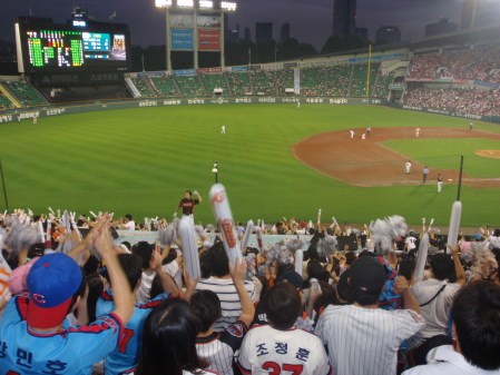 Actually I got a taxi to just about every football ground in Gangneung. I’d taken the precaution of asking the lady in the Tourist Information Office to write down the name of the stadium in Korean for me as I didn’t want the same arse crackery as I’d had trying to get a taxi to the Seoul Martyrs ground a couple of weeks earlier. Unfortunately she had written down the name of a stadium that Gangwon had occasionally played at but, as you might have guessed, weren’t playing at that evening. Not to worry, the taxi driver told me that he knew where the other stadium was and he confidently took me to a couple of artificial pitches belonging to a school up in the hills on the outskirts of town. Now I’ve never seen Gangwon’s stadium before, but I was pretty sure that wasn’t it either. Third time lucky, he dropped me at the real place twenty minutes before kick off with a big grin and a generous reduction on the metered fare.