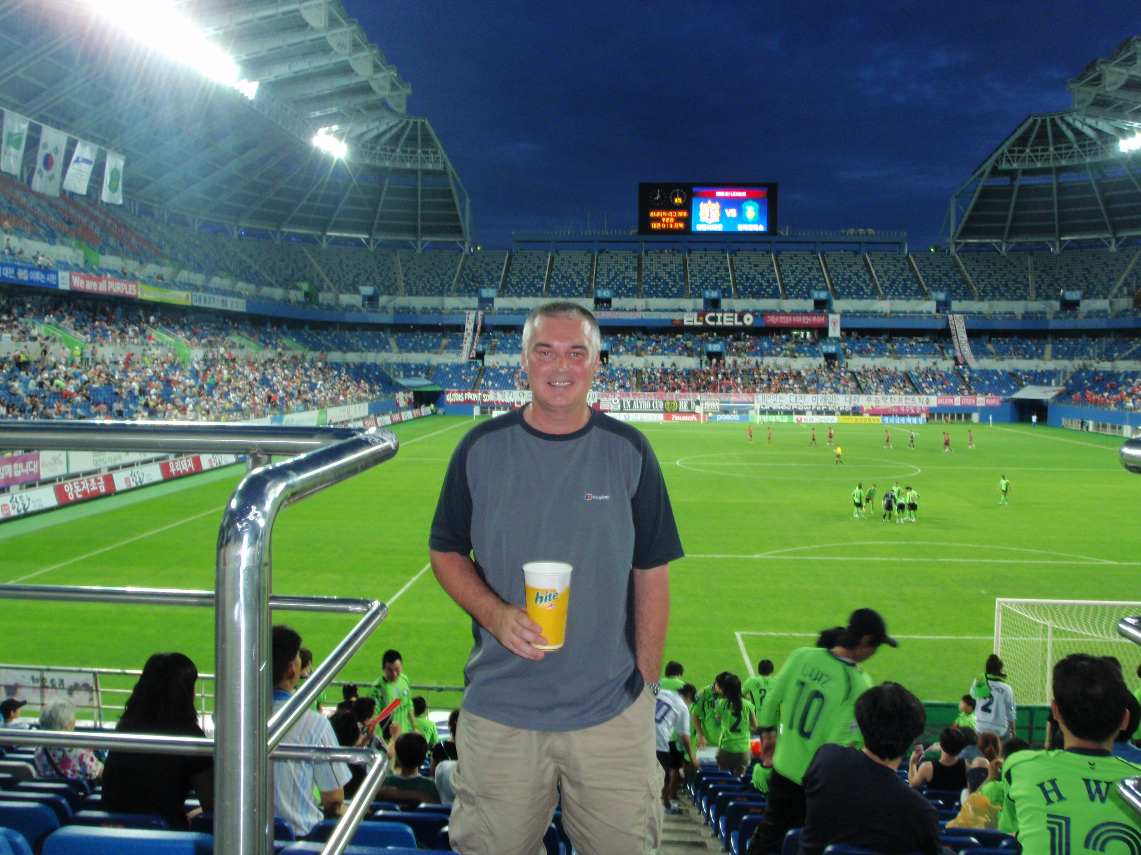 I got to the ground about an hour before kick off and bought a ticket for ten thousand won. It looked as if you could sit wherever you liked as the ticket didnt seem to specify a particular stand. With plenty of time in hand I joined a few fans sat outside a 7-Eleven convenience store and had a beer whilst watching a line of people trying to win a vuvuzela by scoring a penalty past an inflatable goalkeeper. I was pleased to see that not many succeeded as whilst I enjoyed the novelty that the vuvuzelas brought to the World Cup I’d rather they didnt catch on elsewhere.
