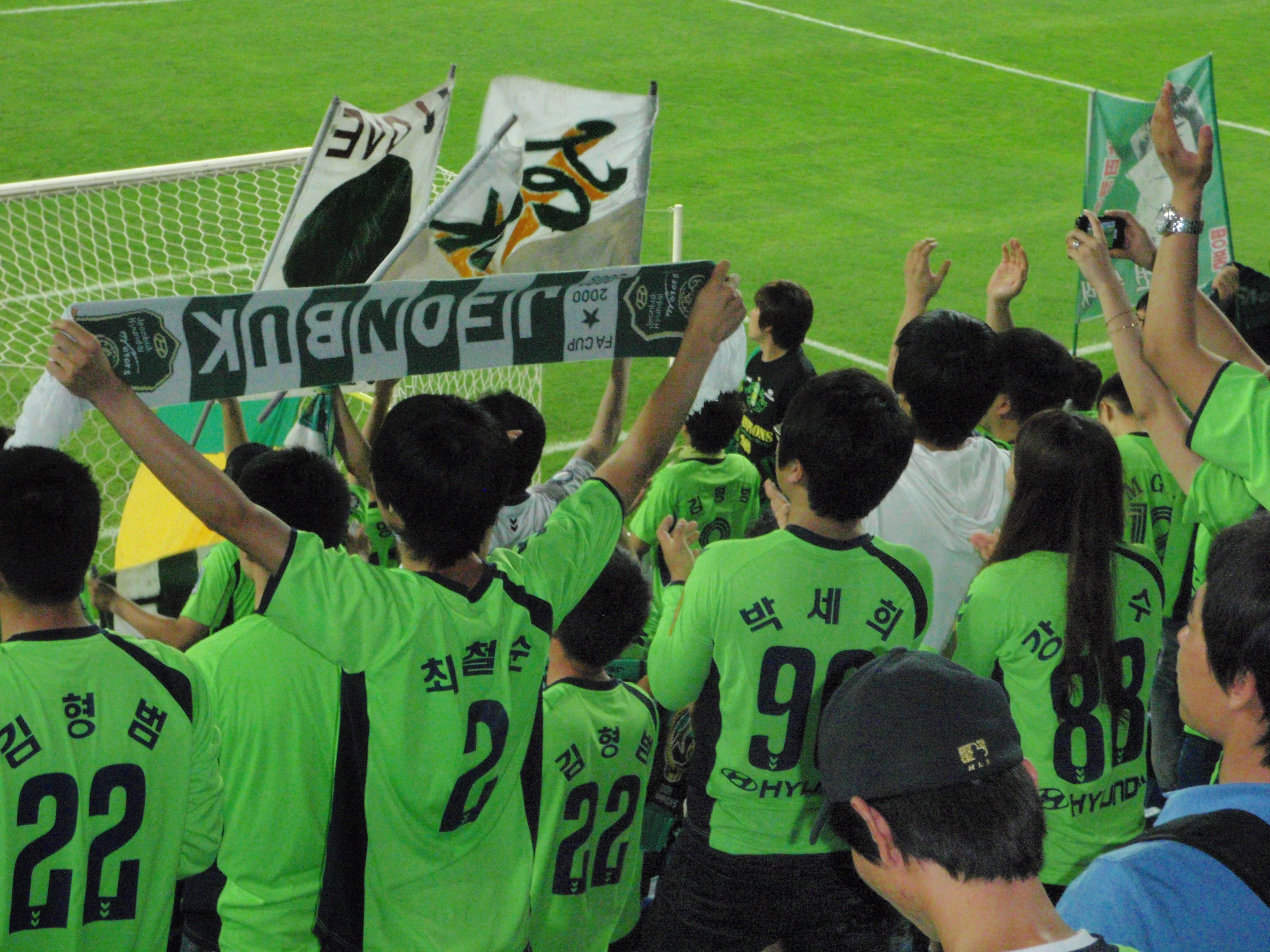 Jeonbuk were in their usual luminous green shirts with Daejeon in maroon. Just before kick off the Jeonbuk fans unfurled a variety of home made banners that looked like they had been made after, or perhaps during, a particularly heavy drinking session. Quite a few of the Daejeon fans were playing those little cymbals alongside their songs and so sounded a bit like a group of Buddhist monks. Even so, it’s still better than the vuvuzelas.