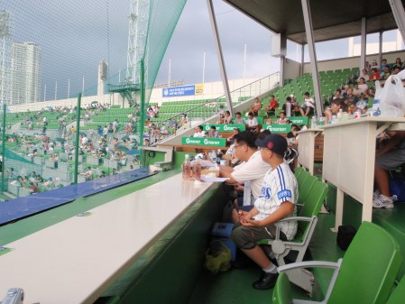 After the previous weeks visit to the outfield at the Jamsil Stadium I thought it would be quite good to be a bit closer to the action and we got seats in the posh bit right behind the catcher for twenty thousand won each. They were front row and with a table in front of us for food and drink. The only downside was that it looked as if the roof didn‘t quite extend far enough to protect the first couple of rows if it rained. However, it was hot and sunny so I wasn’t too concerned.