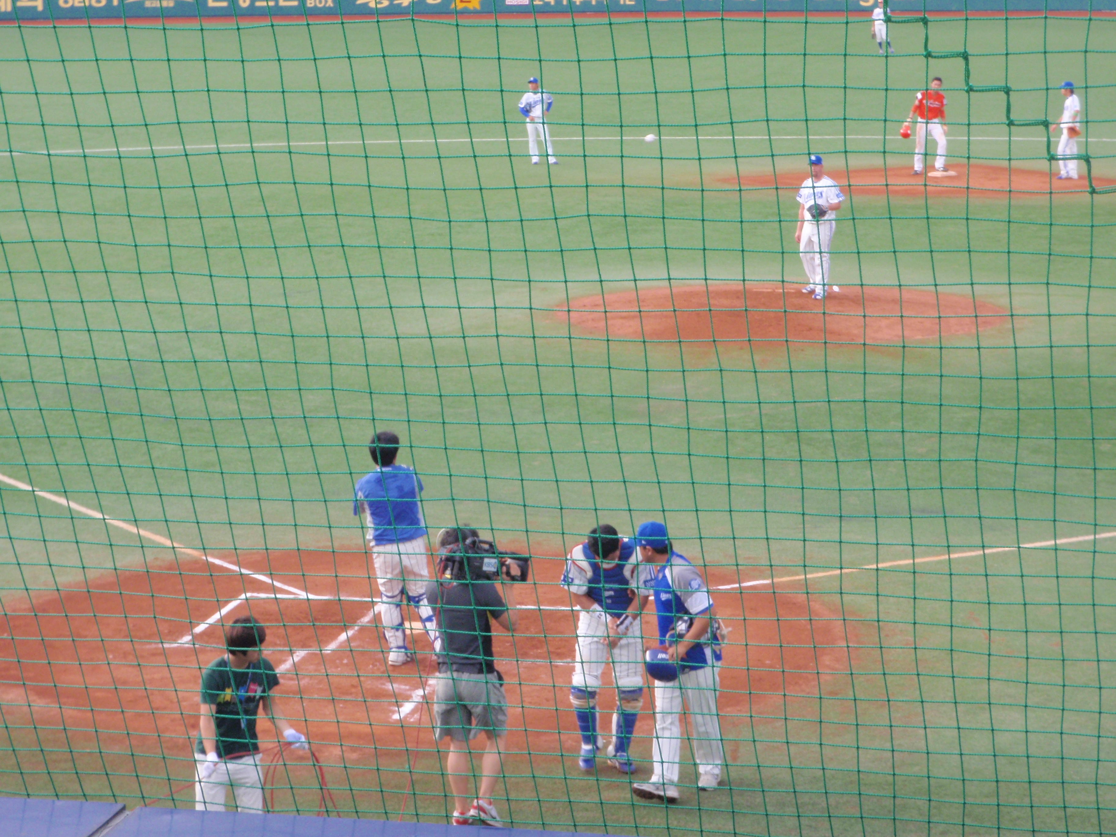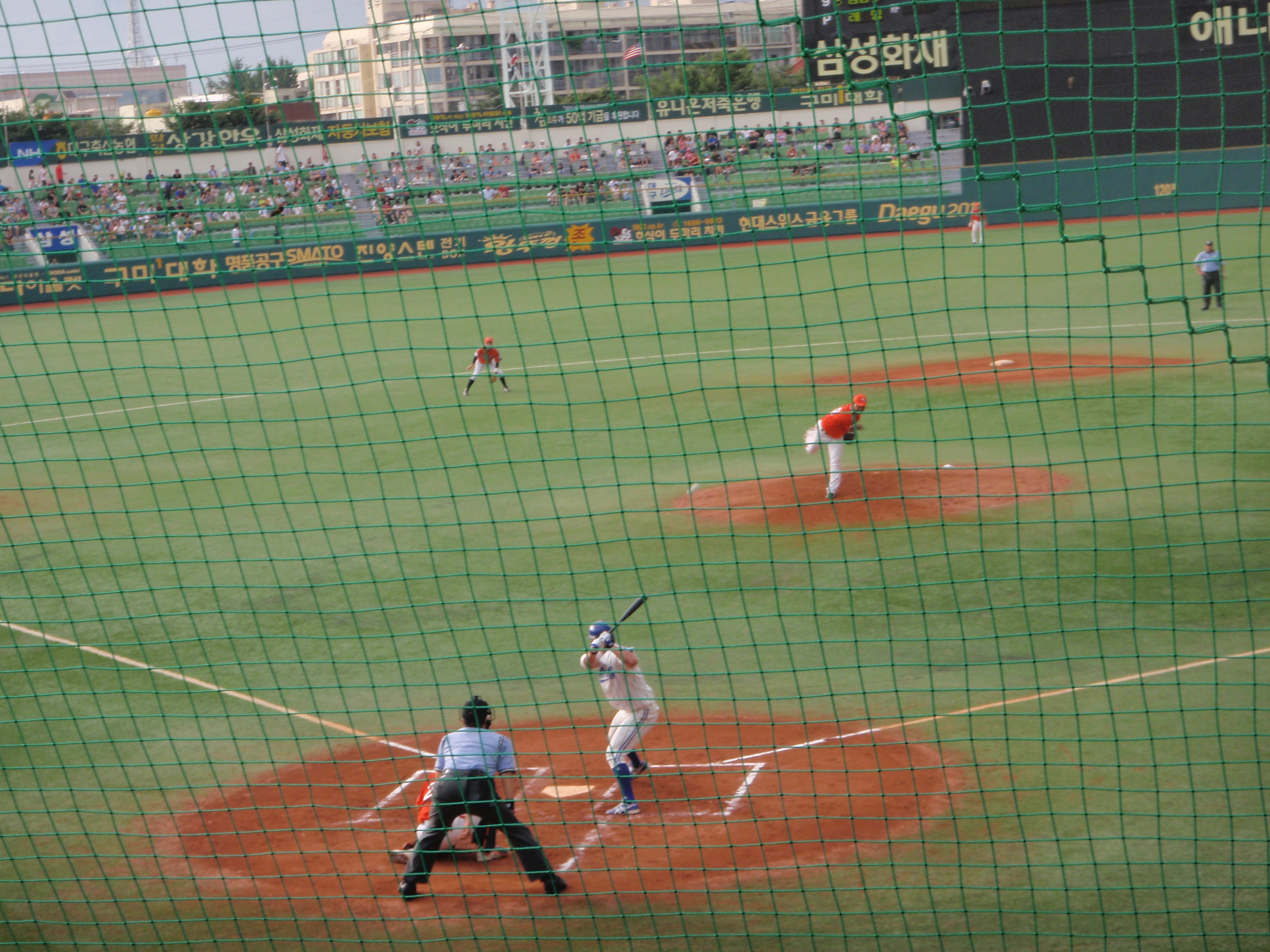 At six o’clock it started to pour down with absolutely torrential rain that had the players running for the dugout and Jen and I scurrying to the back of the stand. Ground staff were quickly out with tarpaulins but the water was lying in pools around each of the bases. After a while I managed to get a glimpse of the Daegu game in the football stadium next door. The players were still out there, but it looked as if all of the fans were in the concourse.