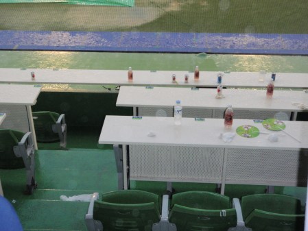 I was waiting for the announcement that the match would be abandoned when the rain started to ease off and within a few minutes a combination of the drainage and blokes with brushes had cleared most of the water away. At seven o’clock we were off again. The only problem for us was that our front row seats were still ankle deep in water. Again the staff did the business and the excess was soon swept away and the seats and table dried off. We got another forty five minutes of action before the next thunderstorm arrived with the scores level at four apiece. We moved further back again, this time taking the seats of some people who had decided that enough was enough. A tramp had come in off the streets, more for a bit of shelter than the prospect of seeing the remaining innings I imagine, and he occupied his time by collecting up the uneaten fried chicken that people had left in their hurry to get away. He didnt seemed too interested in the chocolate water though.