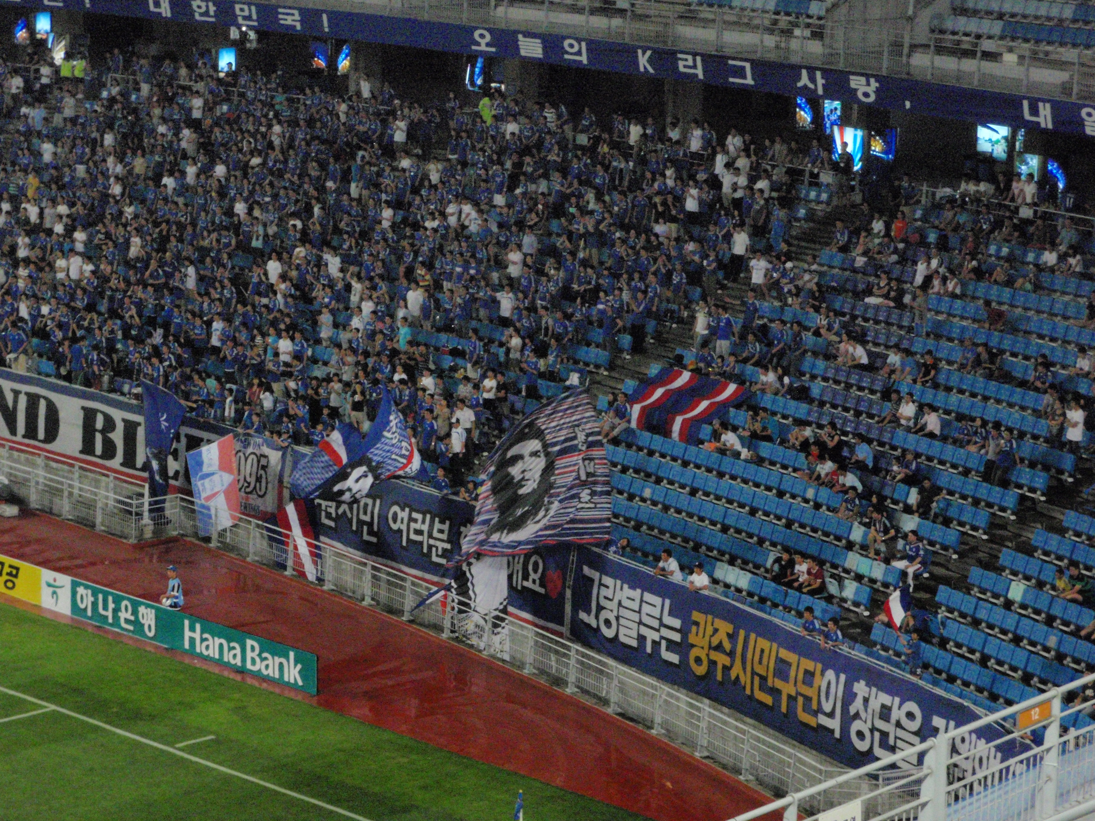 Ten minutes before half time Suwon took the lead with a Kwak Hee Ju header after a disputed free kick was floated into the box. The Suwon fans behind the goal celebrated by bouncing up and down, similar to the way that Rangers do, edging a yard or two from side to side as they did it. They also waved their flags, two of which had the face of Che Guevara on them. He seems pretty popular at the football over here, Jeonbuk had no fewer than five flags with that iconic image on them.