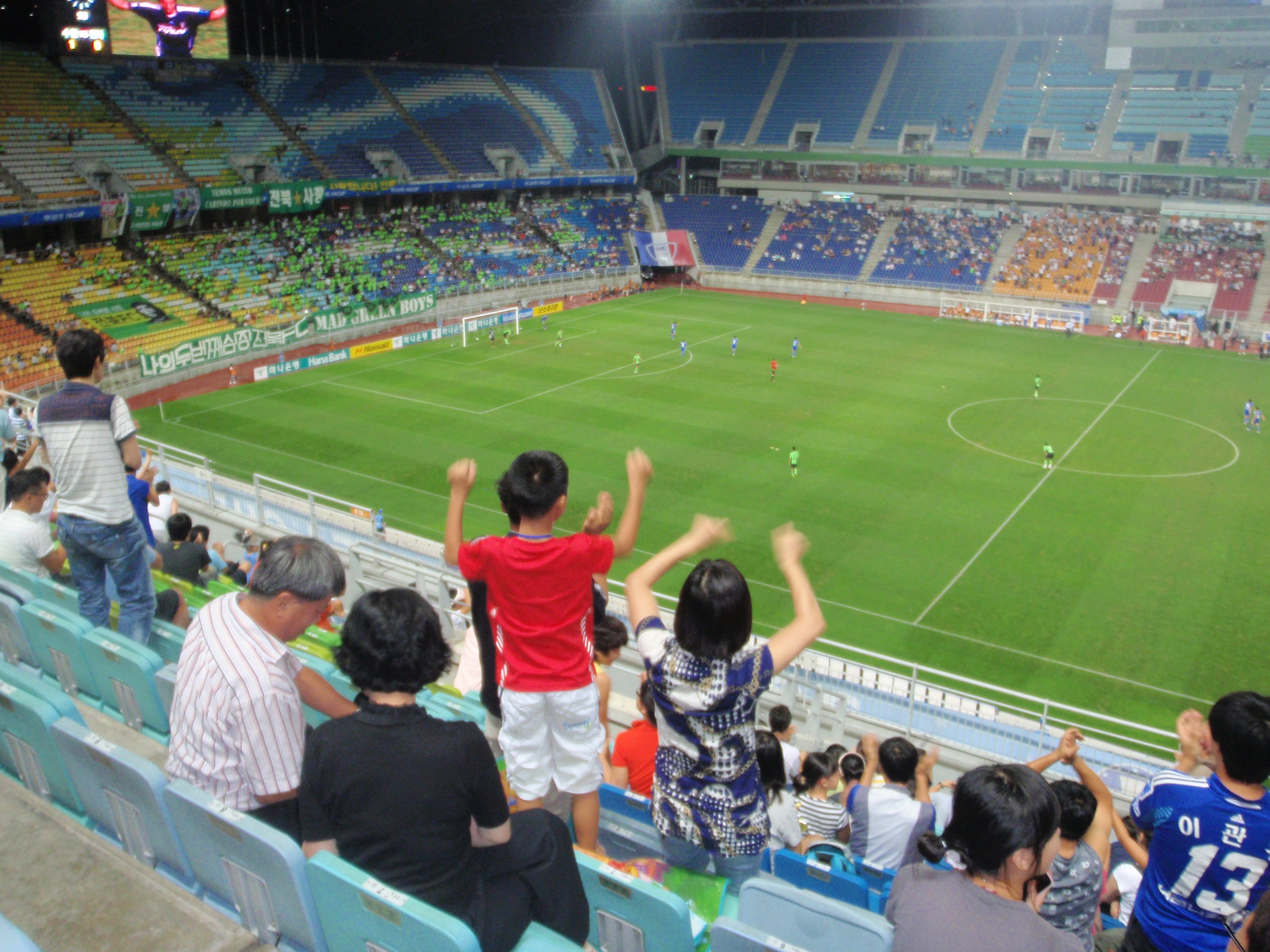 By the time I got into the ground the clock on the scoreboard showed that eighteen minutes had gone and that the game was still goalless. Lee Dong Gook was back up front for Jeonbuk, having missed the last two games due to his suspension for elbowing a Busan defender in the chops a couple of weeks earlier. There wasn’t really much of a crowd, with the upper tiers virtually empty. Jeonbuk looked to have brought a few hundred fans with them whilst Suwon had a very good turnout behind the north stand goal.