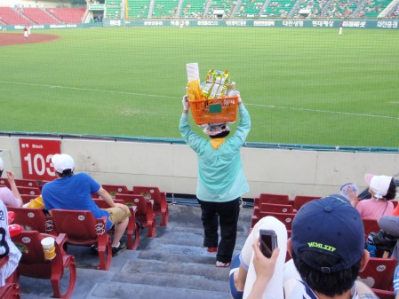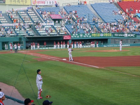 So, with the hiking out of the way I had the baseball to look forward to. Jamsil is only three stops from my apartment and I was able to leave in plenty of time. I picked up a ticket from a tout outside for ten thousand won which might have been just below face value. At those prices, it’s not so important. It was for the red zone though, which is the lower section, beyond first base, prime territory I reckoned for being knocked out cold with a stray baseball.