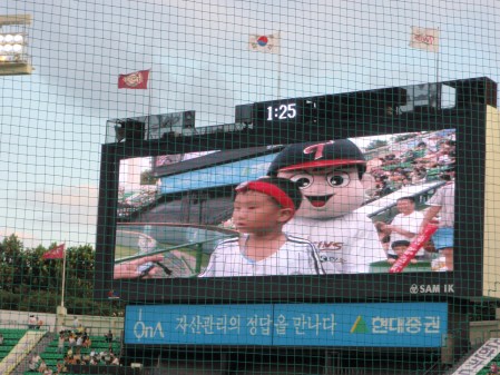 Thats enough of how the Korean baseball works for now. The stuff that goes on in the crowd is much more interesting. Between innings there is usually something to watch despite there only being a two minute turnaround. More often than not it’s couples being made to kiss on demand to their intense embarrassment. Occasionally though, like today, there’s a little gem. The entertainment on this occasion involved small children being lined up for a head shaking competition. Each had a digital monitor attached to his or her forehead and they then had to violently shake their skull from side to side whilst the monitor counted the number of times that their brain revolved in its cerebrospinal fluid. They did all take a small prize back to their seats where I imagine they sat quietly for the rest of the game contemplating a future selling elastic bands for spectacles in subway carriages.