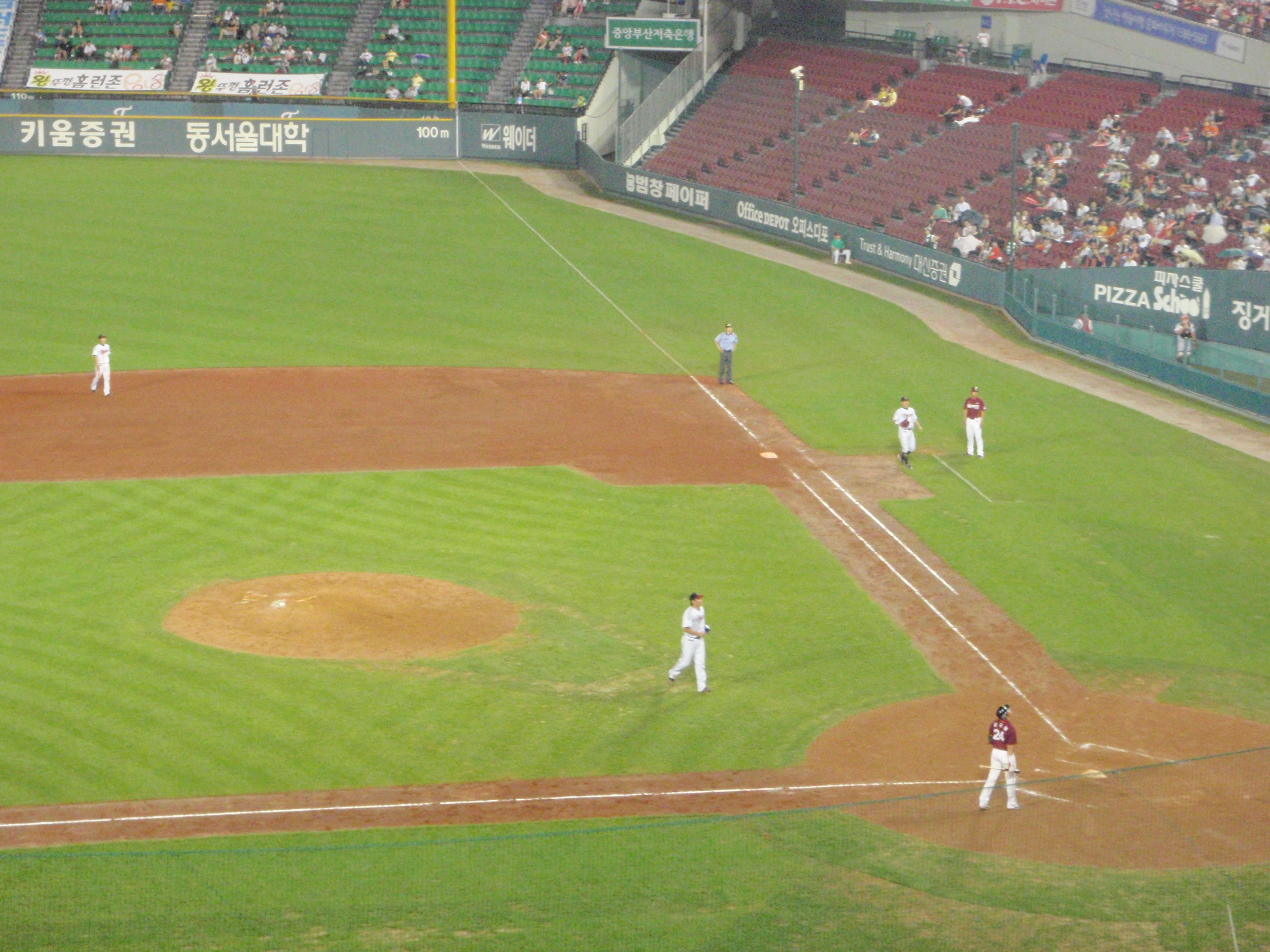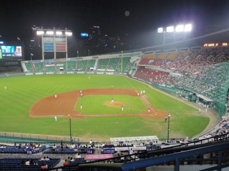 We got a couple of tickets for seven thousand won apiece and made our way into one of the stands with a curvy roof. If we’d wanted, we could have sat in the media section, complete with little tables, but it was a bit windy so we went down to the lower tier instead and sat in what looked like a VIP section. I’d had a look for somewhere selling beer but couldn’t see anything, although I can’t have been that desperate as there was still time to nip back outside and pick up a couple of cans if I’d wanted.