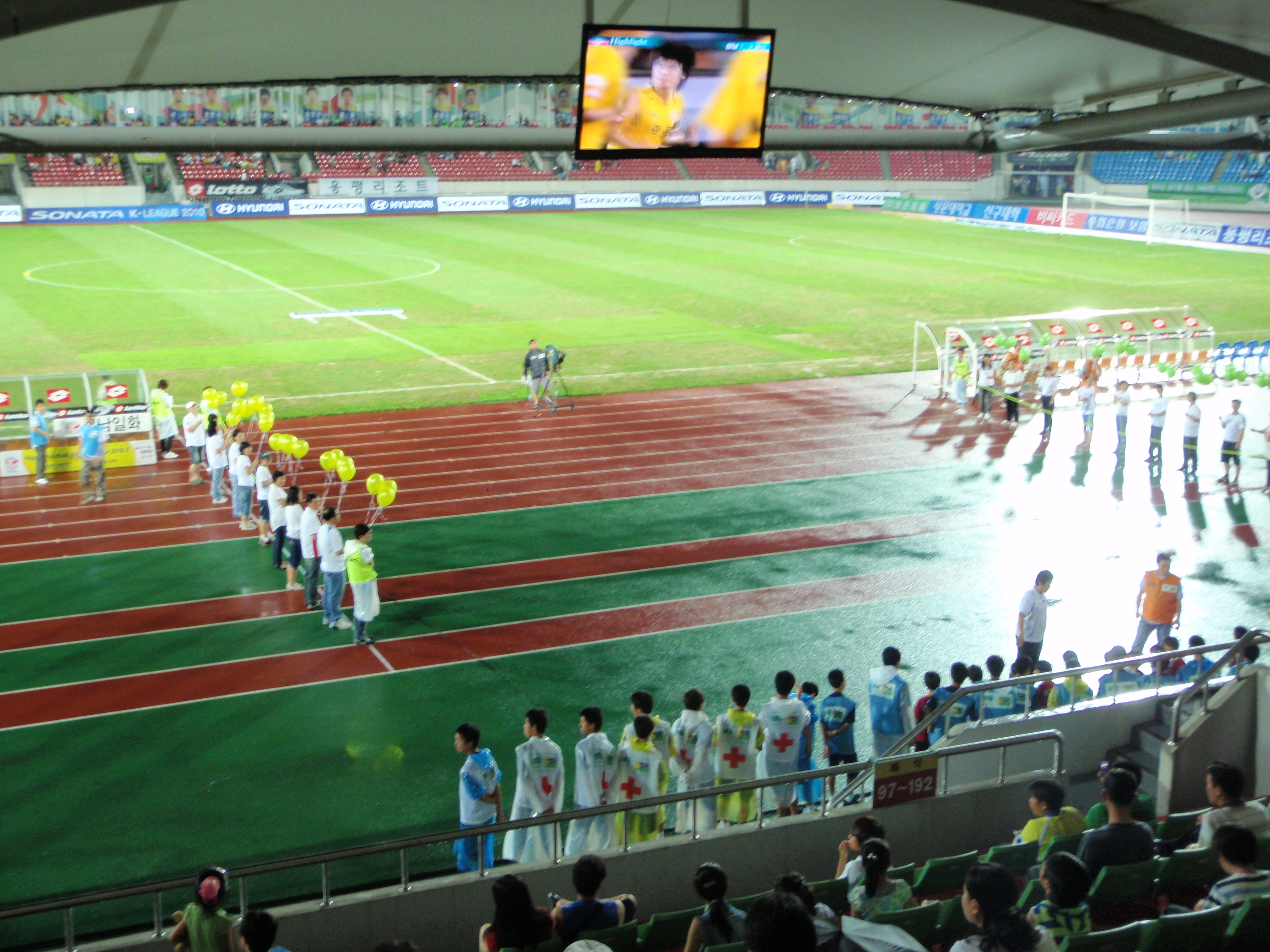 I bought a ticket for the west stand for twelve thousand won on the basis that it had the biggest roof. The rain was still coming down and I wanted to be sure of staying dry. If I’d taken the option of joining the fans behind the goal then I could have got in for seven thousand won. The players were about to come out onto the pitch as I took my seat and a guard of honour was waiting for them, complete with balloons in the team colours.