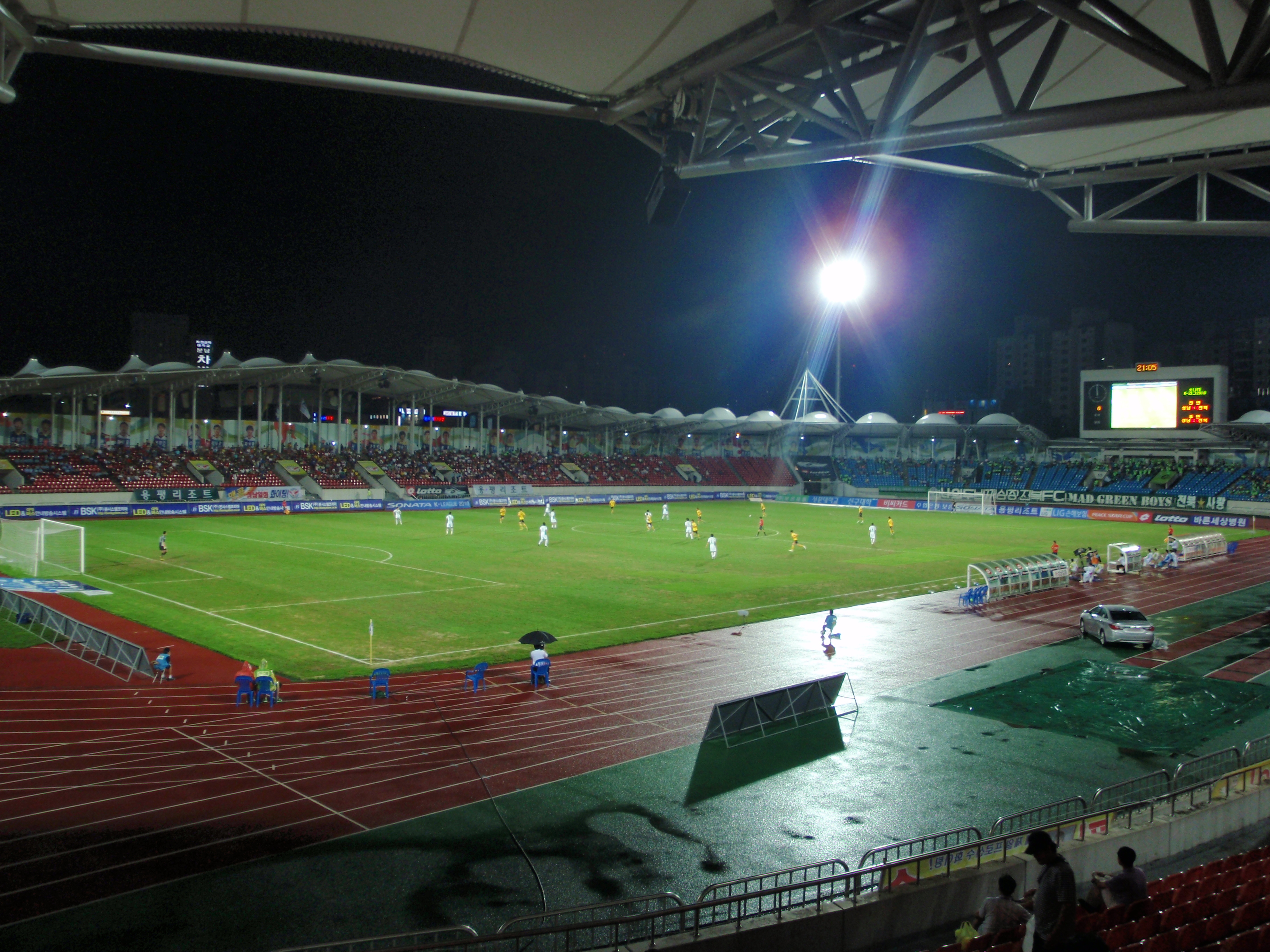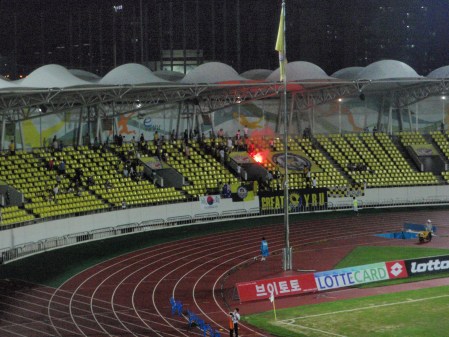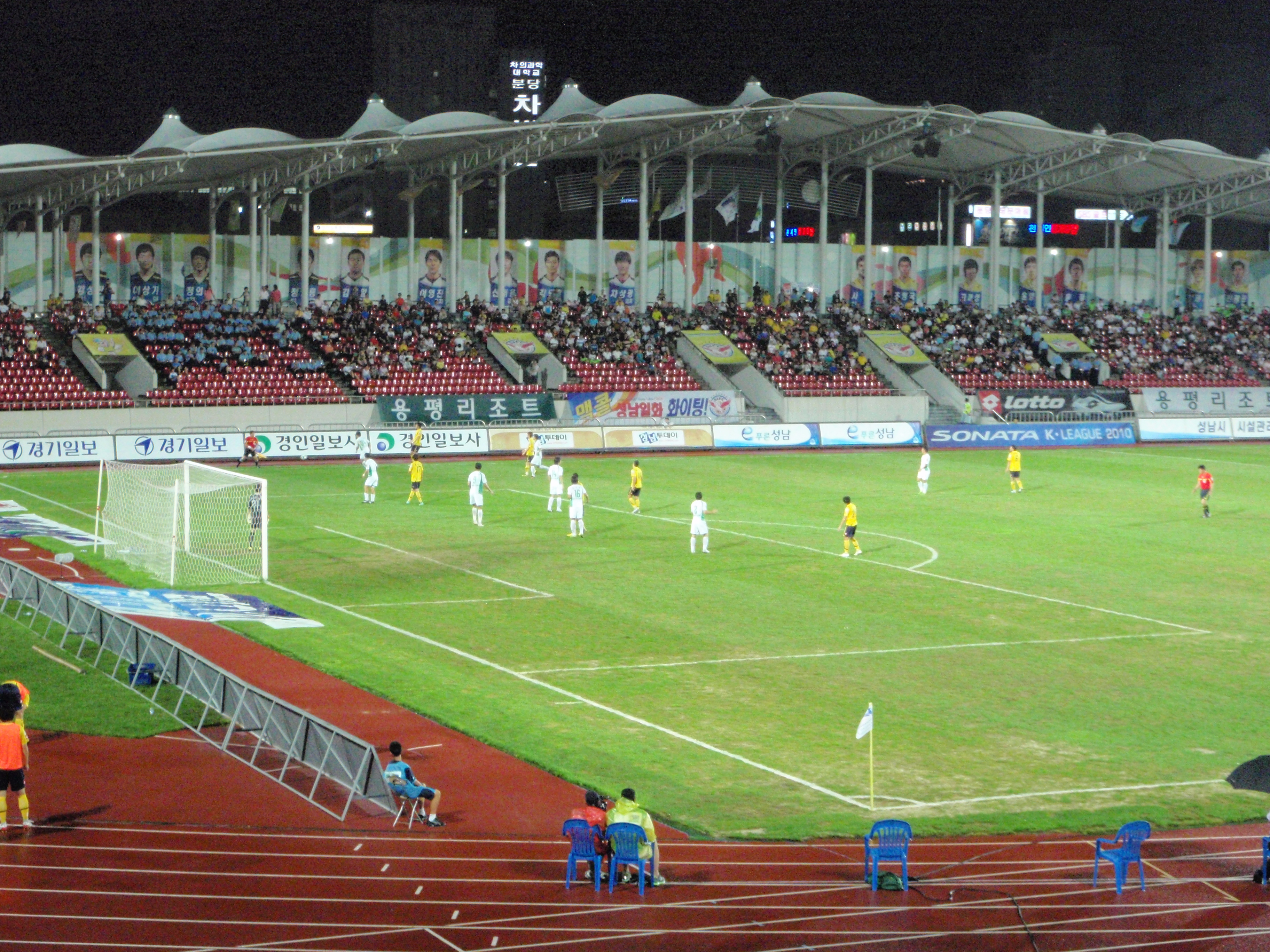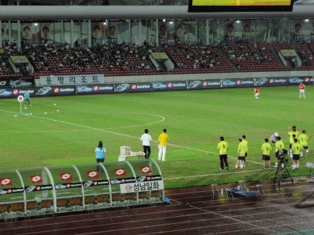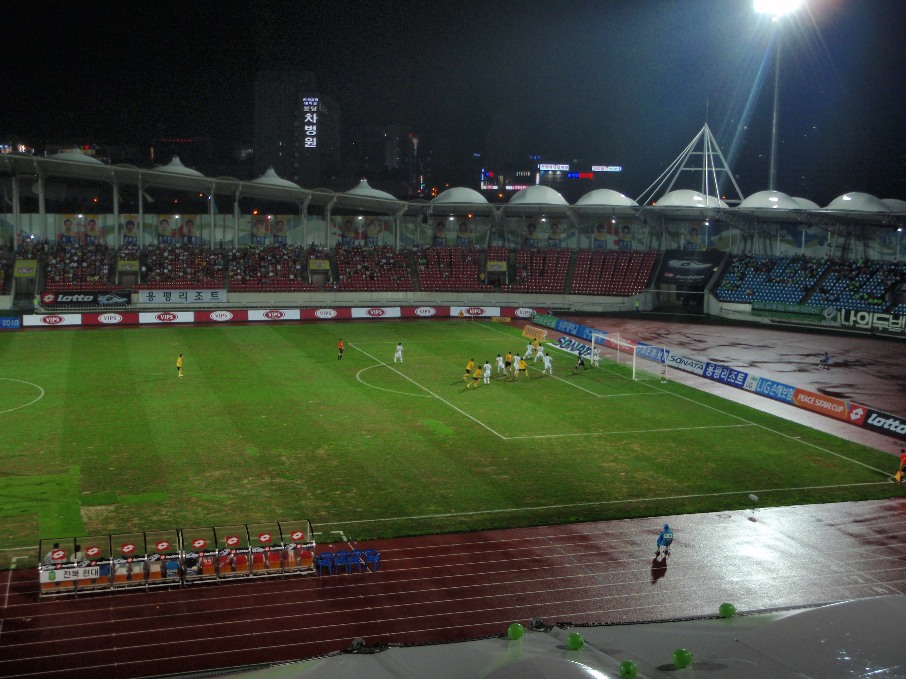 After the excitement of a trip to the shops I took the forty minute ride on the subway to Seongnam’s ground. It’s actually the closest K-League stadium to me, so it’s a little surprising that it’s taken me six months to see my first game there. I wasn’t quite sure of the directions once I got out of the subway so I thought I’d take a taxi. The first three drivers that I tried appeared not to understand Tancheon Soccer Stadium, nor my mime of an exquisitely crafted chip into the top corner. When I got into taxi number four I realised why the others weren’t interested. We turned the first corner thirty yards away and I could see the stadium just ahead. It was no more than a ten minute walk.