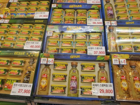 If they have any live ancestors they usually give them a present and this years ’must have’ gift appears to be a Spam Box Set. You can get them in various sizes depending, I suppose, on the amount of respect you have for the intended receipient. Some of the more extravagant boxes include bottles of what I’m guessing is a suitable dressing for tinned chopped pork.