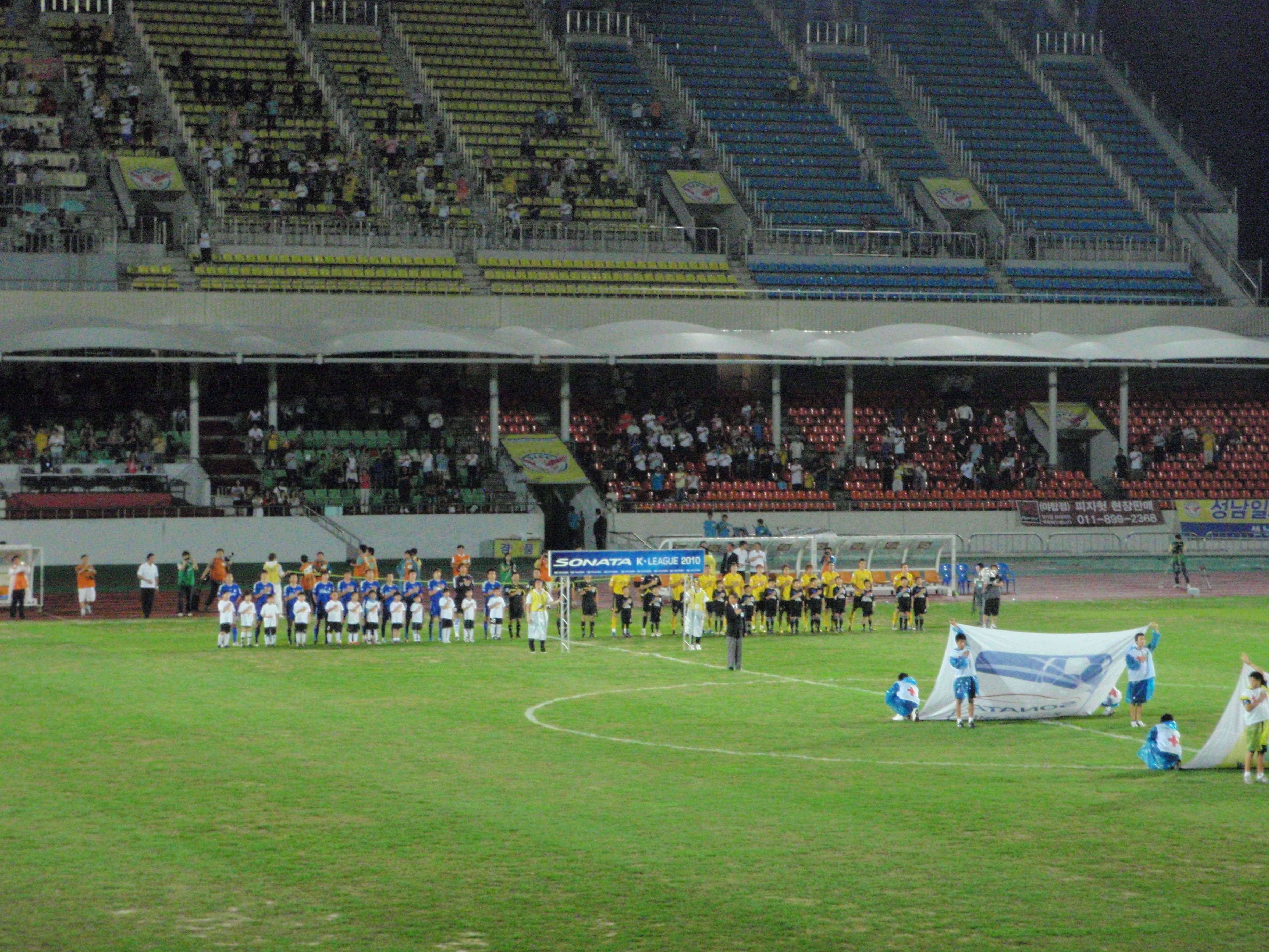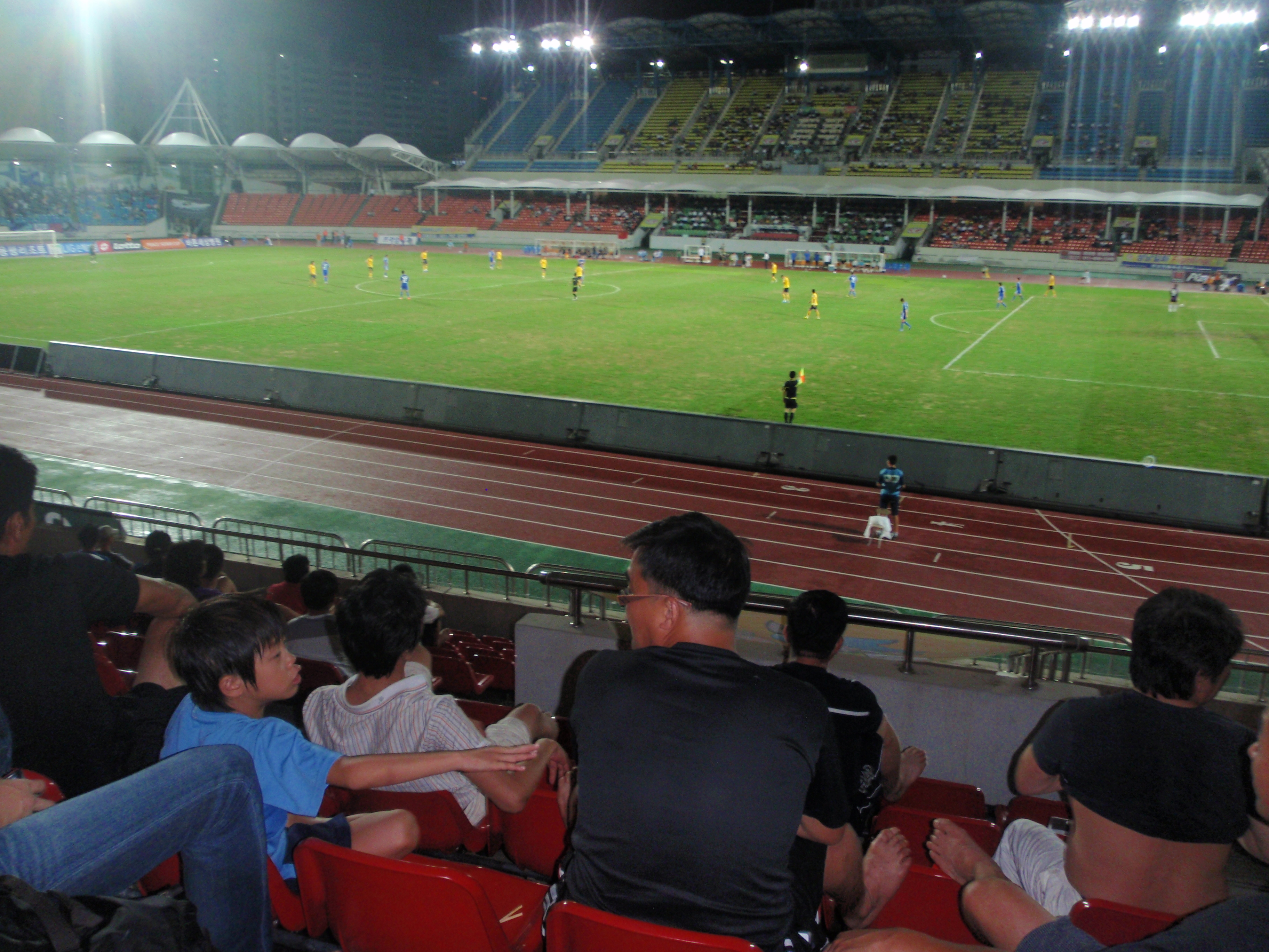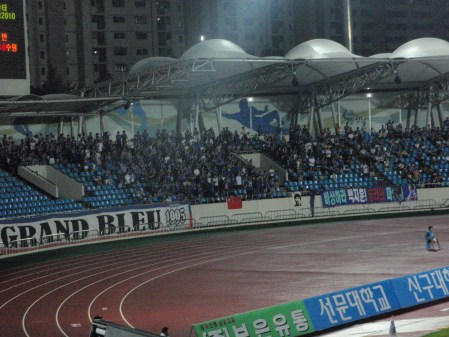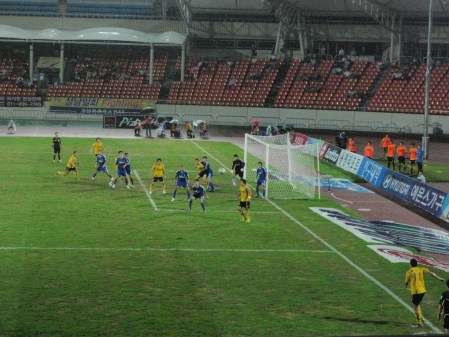 On Saturday I went into the West Stand, so this time I thought I’d sit on the opposite side to get a different perspective. I paid nine thousand won, which is the same as the travelling Suwon fans behind the goal to my left paid. There were about two hundred and fifty of them, compared to the thirty or so Seongnam supporters doing the singing in the North Stand. There were maybe another thousand people in total in the ground. Of all the fans I’ve seen over here I think Suwon are the best. They seem to turn out in bigger numbers and are more vocal that any of the other teams. Fortunately for them they’ve now got something to shout about after a poor start in the league. They sacked their manager, Cha Bum Kun, earlier in the season and since then have put a good run of form together that looks like getting them a play-off spot.