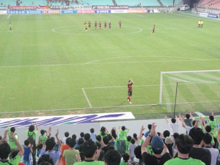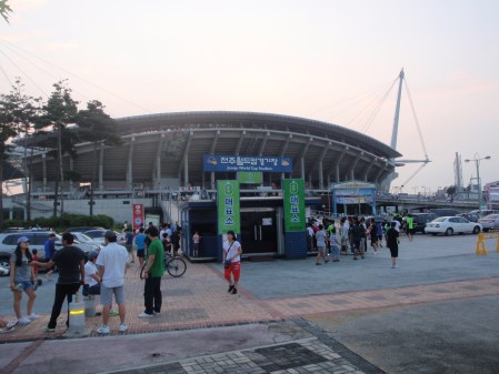 We took a taxi to the World-uh Cup Stadium and bought tickets for behind the goal with the Jeonbuk fans. It was the usual formation for the home team with a couple of defensive midfielders and three more attacking players supporting lone striker Lee Dong Gook.
