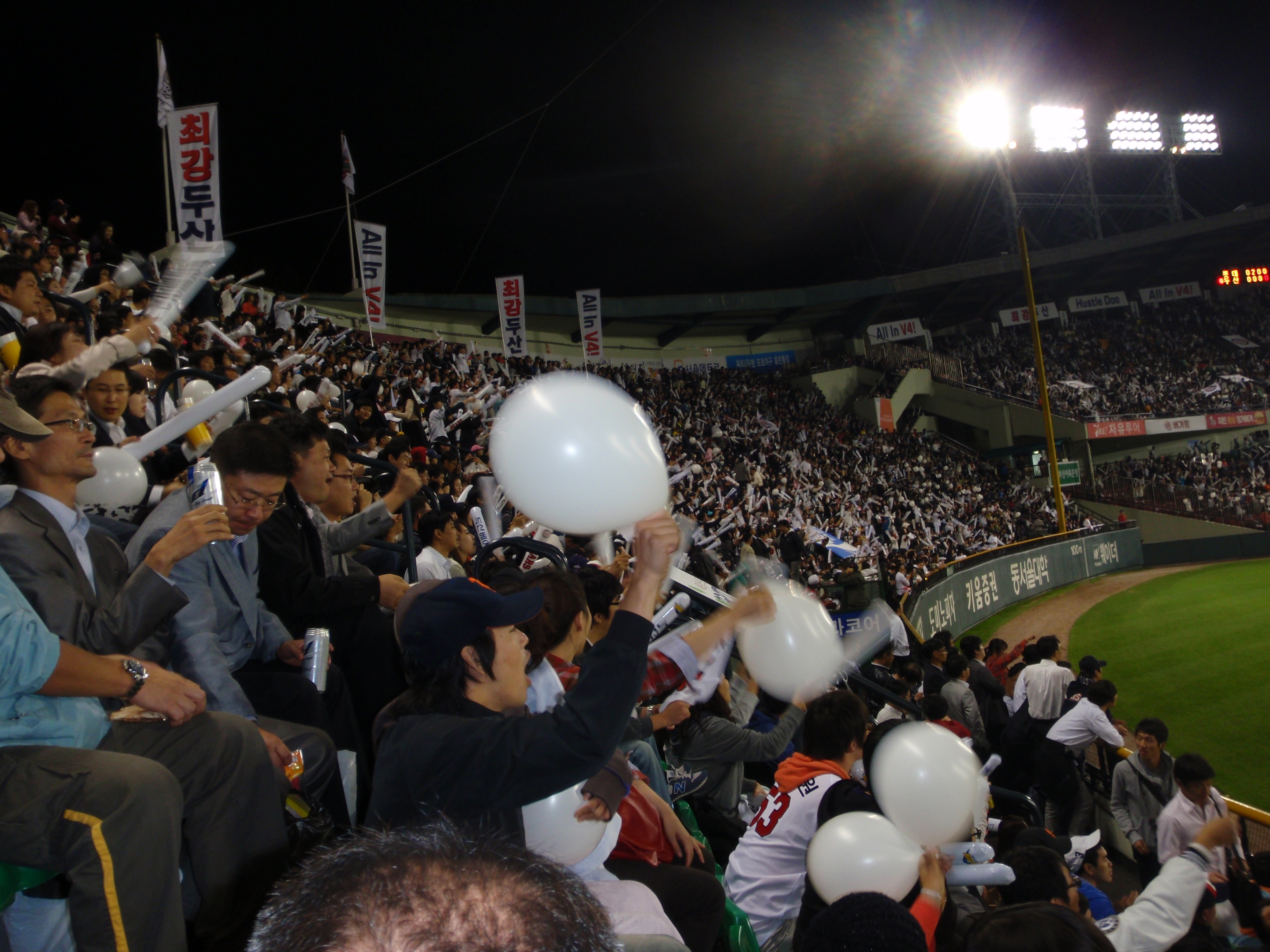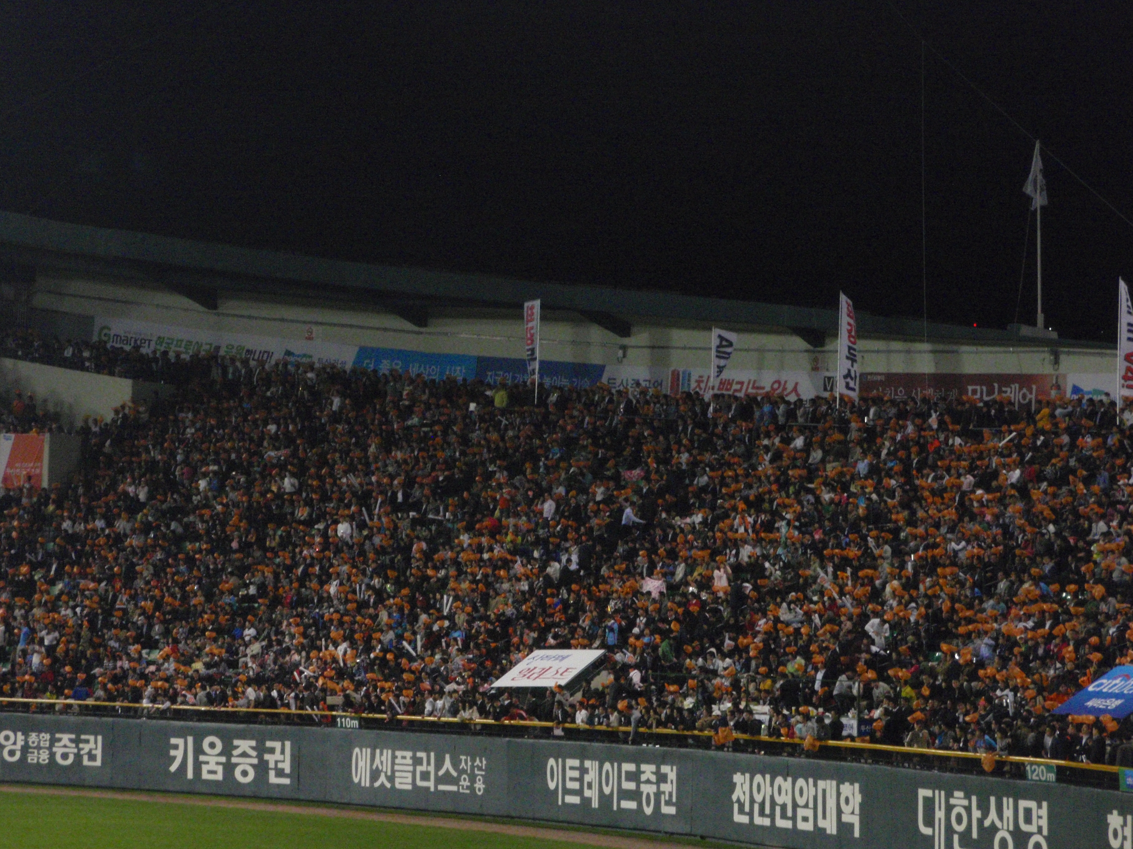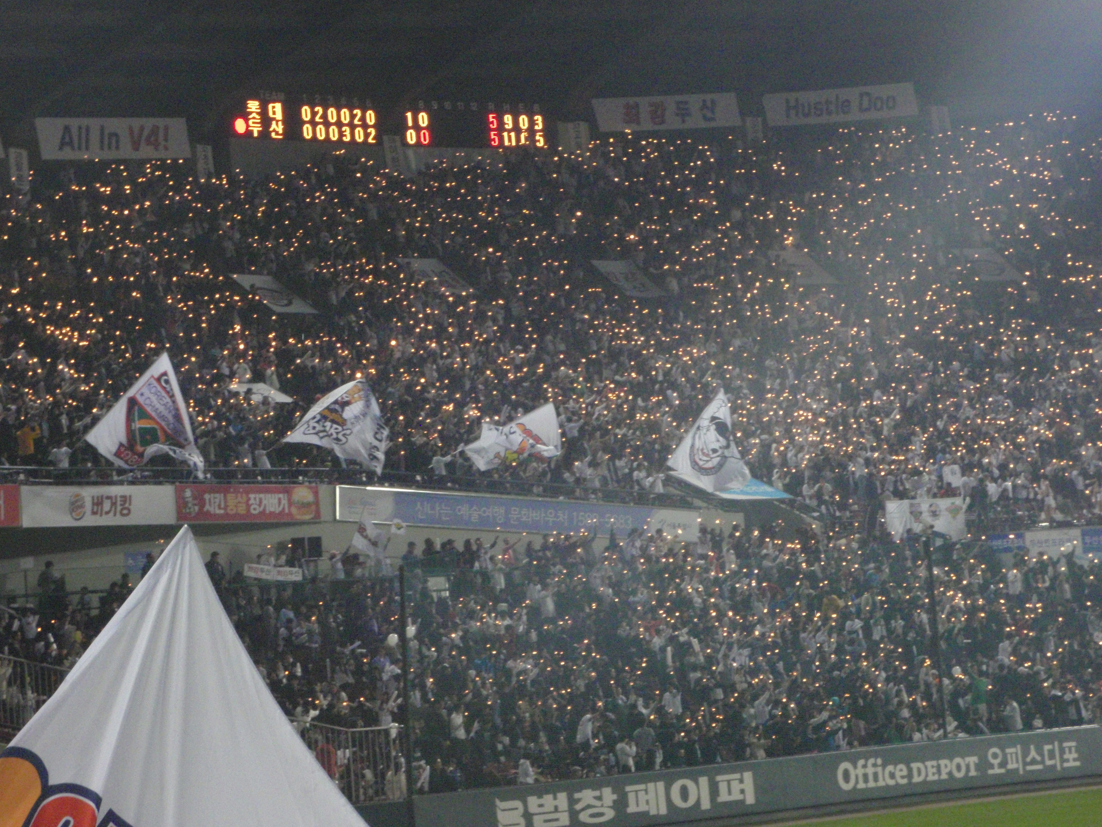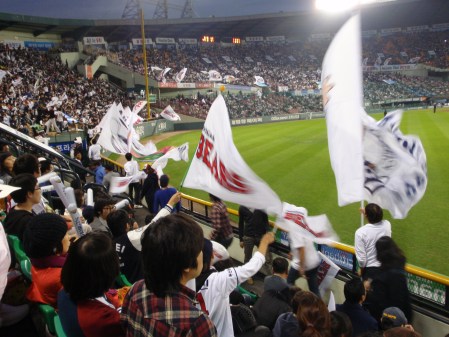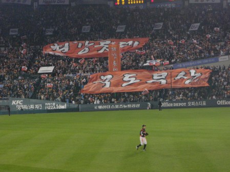 It’s play-off time. No more meaningless regular season games, we are into the stuff that matters now. The first best of five contest was between the Doosan Bears and the Lotte Giants, with the winners then taking on Samsung Lions for the right to a place in the Korean Series against SK Wyverns. The Giants play in Busan, whilst the Bears are based three subway stops away from me at Jamsil stadium. They play the first two games at Jamsil, the third and fourth (if a fourth is necessary) at Busan and then (again if necessary) a fifth and final game at Jamsil.