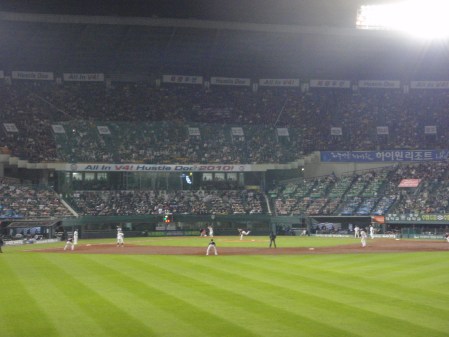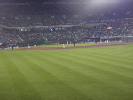 The outfield is free seating and at first we struggled to find seats. I’d say it was probably ninety percent full at that stage, with most of the remaining seats being occupied by coats, handbags and boxes of fried chicken. People were standing three or four deep behind the railings at the back of the terrace. We eventually found a couple of empty seats on the first base side of the stadium, which meant that we were in with the Doosan Bears fans. The crowd, including the outfield, was fairly equally split between the two teams which surprised me when I considered that Busan is two hundred miles away. Looking across at the main stand, quite a few of the seats had yet to be filled. I suppose if you have a reserved seat and can’t get there for the start, it’s not so much of a big deal.
