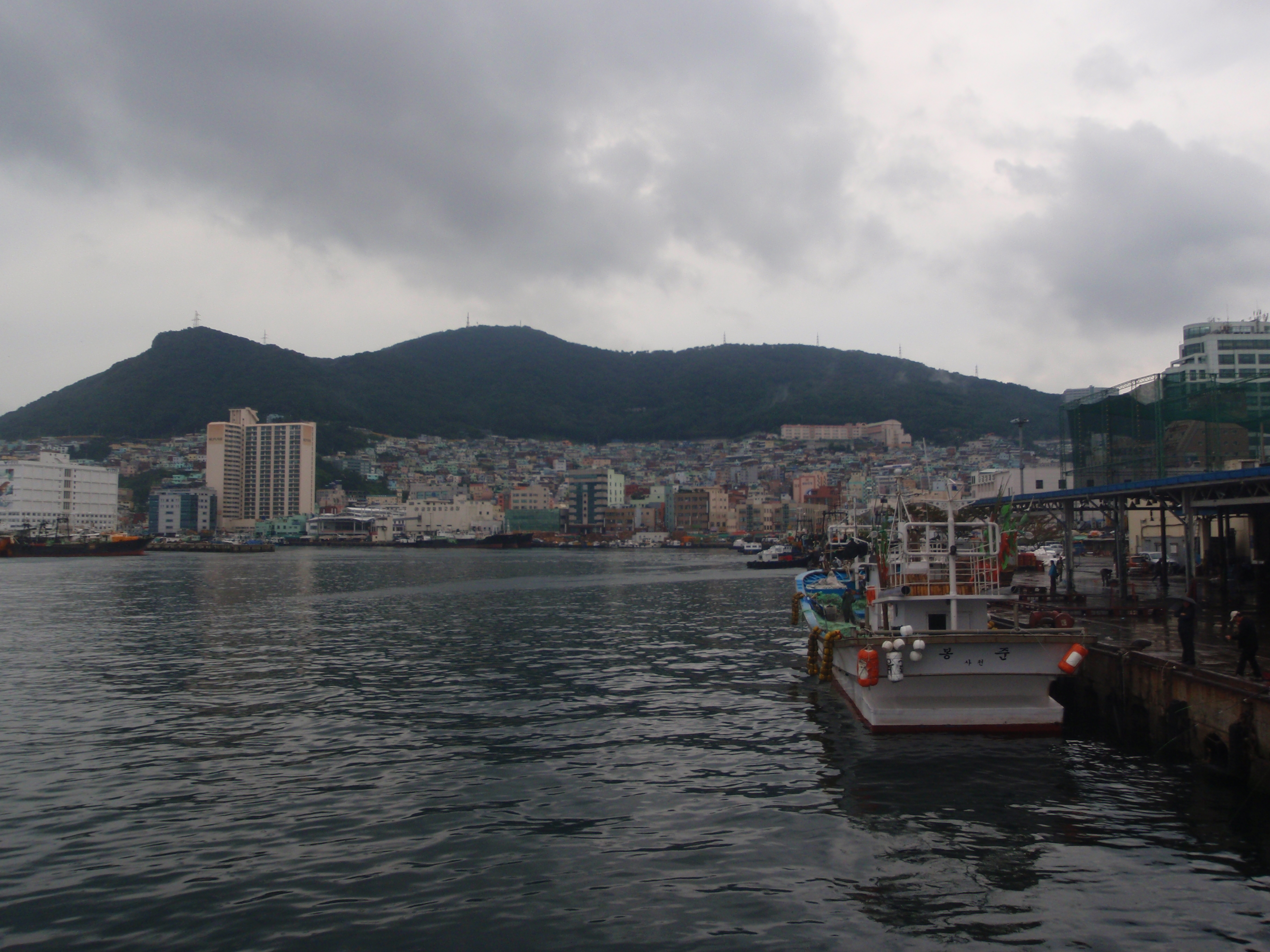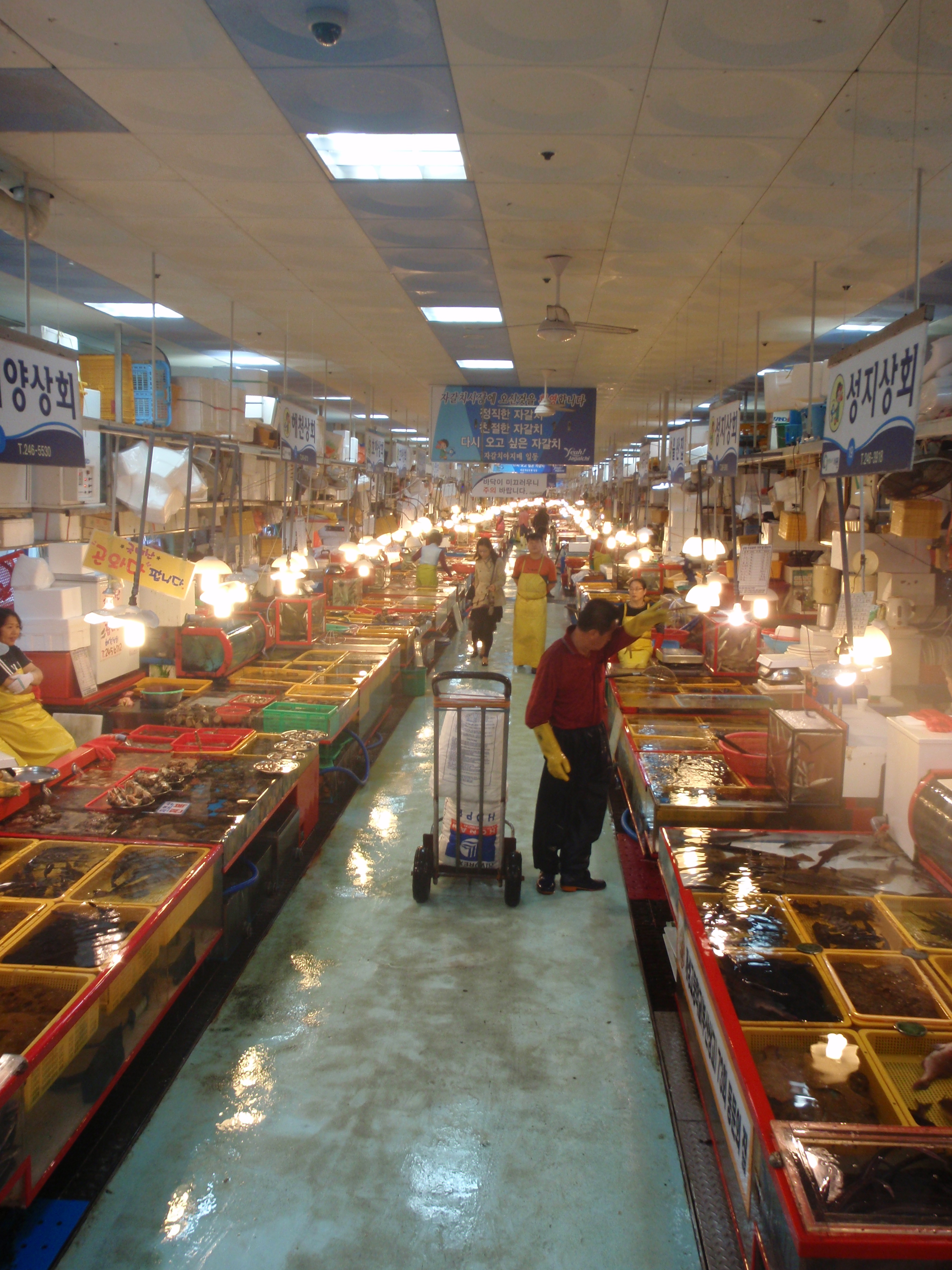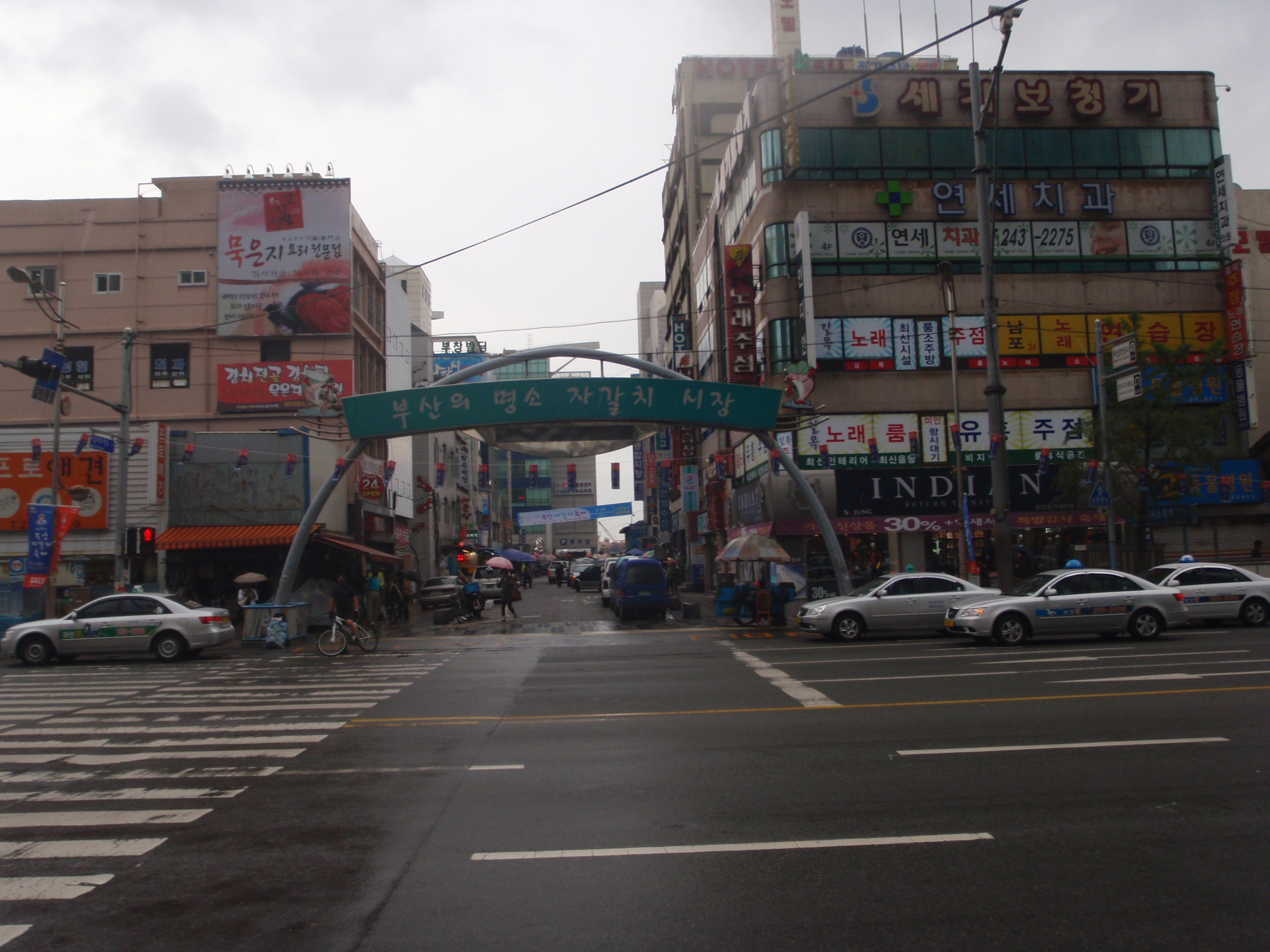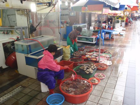 It was raining when I got to Busan just before eleven. Hopefully it would brighten up before the start of the game, I didn’t fancy having made the trip for nothing more than a chance to catch up on my reading on the train. I’d been advised to have a wander around Texas Street which was opposite the station, but with the weather being poor I decided to get a taxi to the Jagalchi Fish Market instead. The first taxi driver had no idea where I wanted to go, despite me pointing at the Fish Market on the map I’d just been given at the Tourist Information Office. The second one I tried grasped it though and ten minutes later I was there.