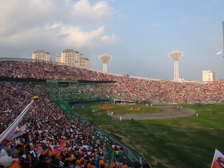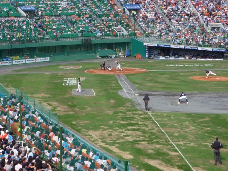 By now it was quarter to one and I thought I might as well make my way up to the baseball. I got a taxi to the Sajik stadium, arriving about half an hour later. As we drew closer I could see that it was an open stadium, with a very large stand that looked to be fullish three-quarters of an hour before the start.
