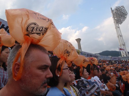 My seat was in the Giants section, beyond first base. With half an hour to go there were still plenty of empty seats, although the unreserved seating in the outfield area was already just about full. I watched the players warm up for a while as the Lotte fans took their seats around me. Most of them had either brought or were making cheerleader style pom poms out of newspaper. A club employee appeared and handed out about a dozen free large flags.