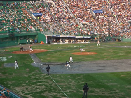 There were a couple of large inflatable, well, inflatables I suppose, hanging over the stadium. There had been a bit of controversy the previous night when a ball that might have gone for a home run or may have been caught, did neither because it hit the balloon. I’d have expected one of the player’s Dads to have stuck a knife in it but both inflatables were still there, possibly on slightly longer ropes though.