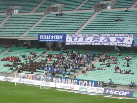 A few minutes into the game about fifty soldiers joined the hundred or so Ulsan fans behind the goal.