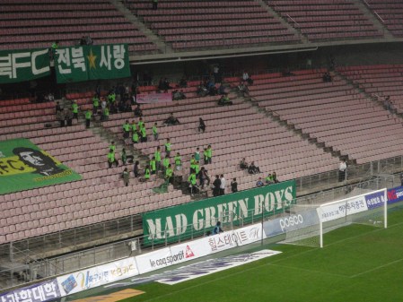 Jeonbuk didn’t bring as many fans as usual with them with only about fifty of their supporters grouped behind the opposite goal. It has just occurred to me that these reports could be a lot more accurate than they actually are. When there are only around fifty fans in a stand it shouldnt be beyond me to count them and tell you exactly how many there are. I’ll try it next game. I might even try counting the exact crowd just to see if I can do it. In fact at some of the lower league games I could probably get you a list of all their names.