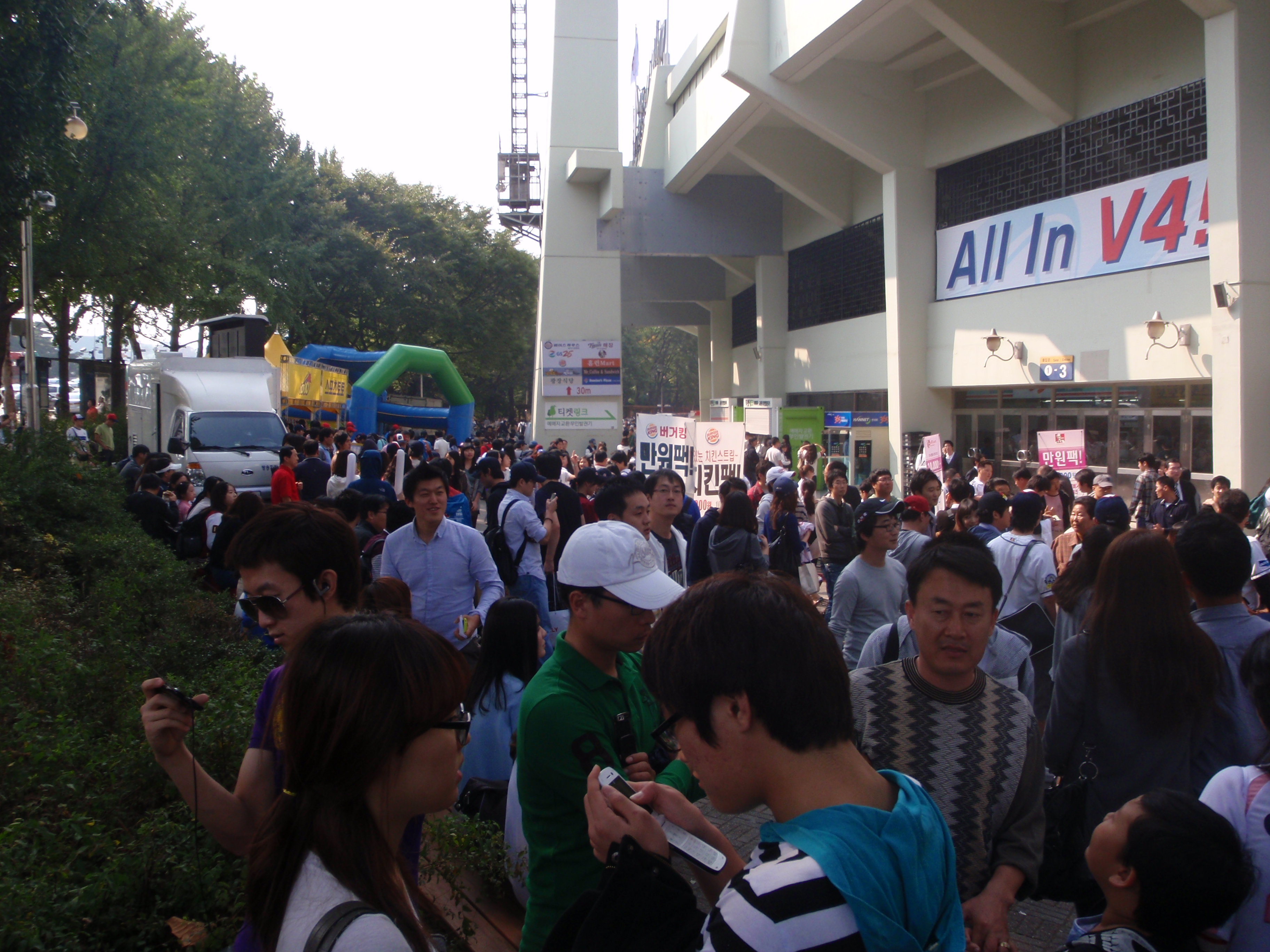 Five hours later I was back in Seoul and a couple of hours after that I met up with Jen outside the Jamsil stadium. It was busier than I’d ever seen it before with fewer touts selling and with lots of people holding up notices stating that they were looking for tickets.