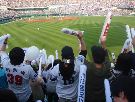 As the game started the Doosan fans released a few hundred white balloons into the air. I’d seen this done at a football game recently where the rain drove the balloons back down again and the ref had to stop the game for players to pop them. The weather was better today though and they safely floated up and away towards the flight path into Incheon Airport.
