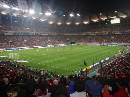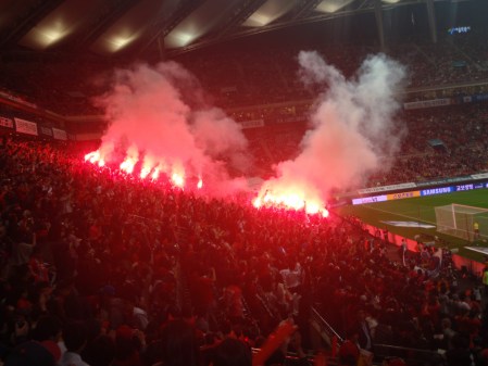 The Koreans did, however, get behind their own team and there were gasps of anguish every time one of their attacks broke down or when Japan looked threatening. The fans in the north stand next to us kept up constant chanting and drumming throughout the game, waving the large flags at the front every few minutes and setting off flares early on. I’d like to try to get into that section for an international match. Particularly one with a sizeable crowd.