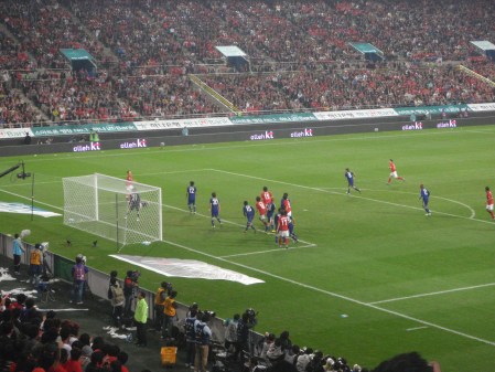 Park Ji Sung wasn’t playing as apparently his knee was swollen with fluid after a training session. I doubt that Fergie will have been too happy about that. The absence of the Korean captain probably reduced the noise levels by a few decibels mind, and saved the medical staff from having to treat the numerous cases of hysteria that tend to break out whenever he touches the ball. The broadcaster still brought their dedicated Park Ji Sung camera crew with them though and every now and then a shot of him watching the game from the sidelines would be flashed up onto the big screen, no doubt with a caption that his knee injury wouldn’t have happened if the Japanese hadn’t agreed to the fixture.