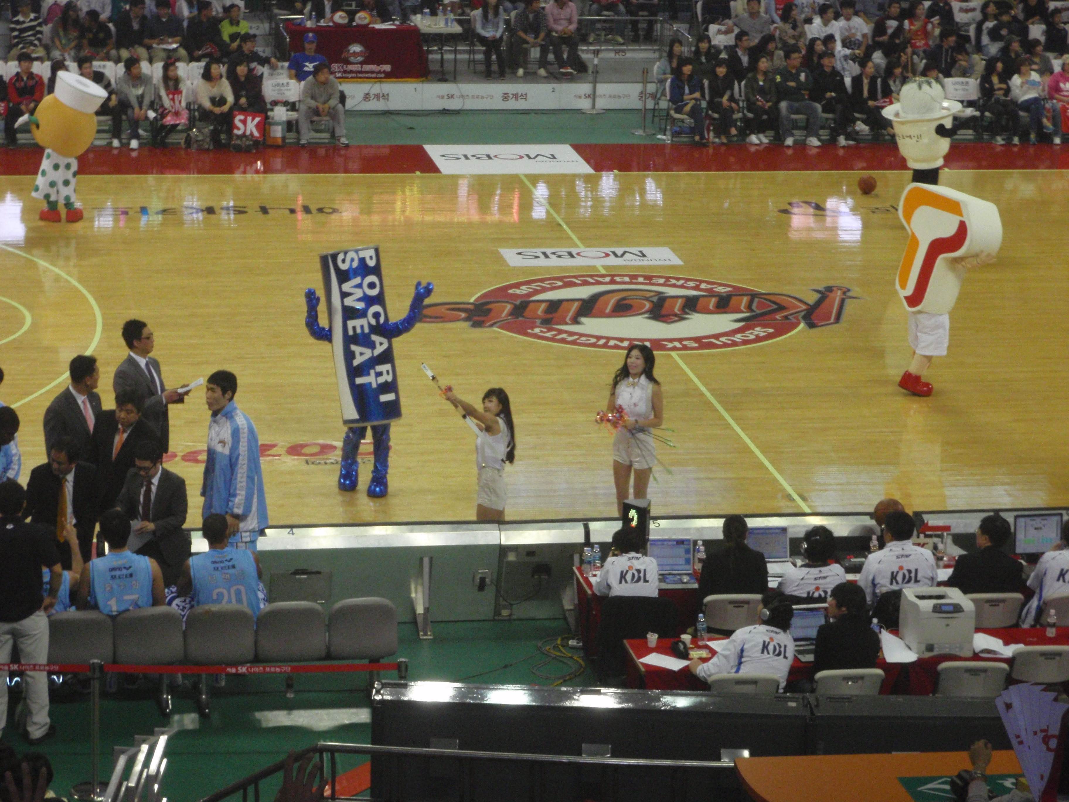 The game wasn’t particularly close. SK took an early lead and pretty much maintained a fifteen point buffer throughout the match. It got temporarily interesting in the final quarter when Busan reduced the deficit to six points at one stage, but they couldn’t ever completely close the gap. I couldn’t work the fans out. They made plenty of noise, but a lot of them seemed to be cheering for both teams. I suppose it’s one way of getting involved when you are a neutral.
