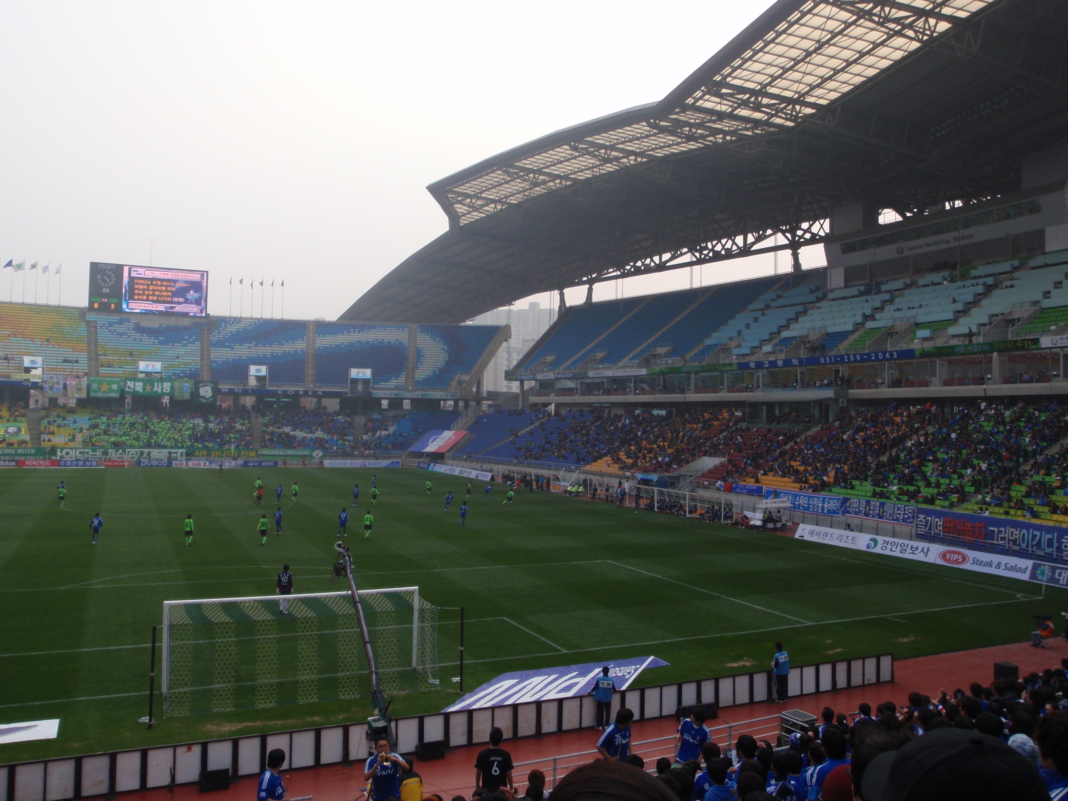 The stadium was impressive. It was built for the Asian Games in 2002 and also hosted three World Cup matches that year. It’s too big, of course, for the attendances that Korean football matches get, even Cup Finals, so someone had come up with the clever idea of building temporary stands on the running track down one side of the pitch and behind one of the goals. Half a stadium within a stadium, if you like. It allowed the fans in those seats to get much closer to the action, although it did mean that the roof on the stadium offered them no protection from the elements. Whilst the temporary stands were just about full, there was plenty of space in the rest of the stadium and despite the attendance being announced as 31,000, I’d have estimated a less impressive 12,000 or so.