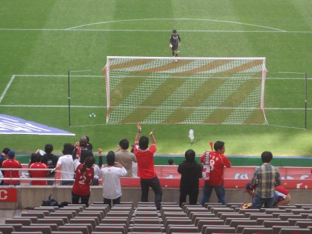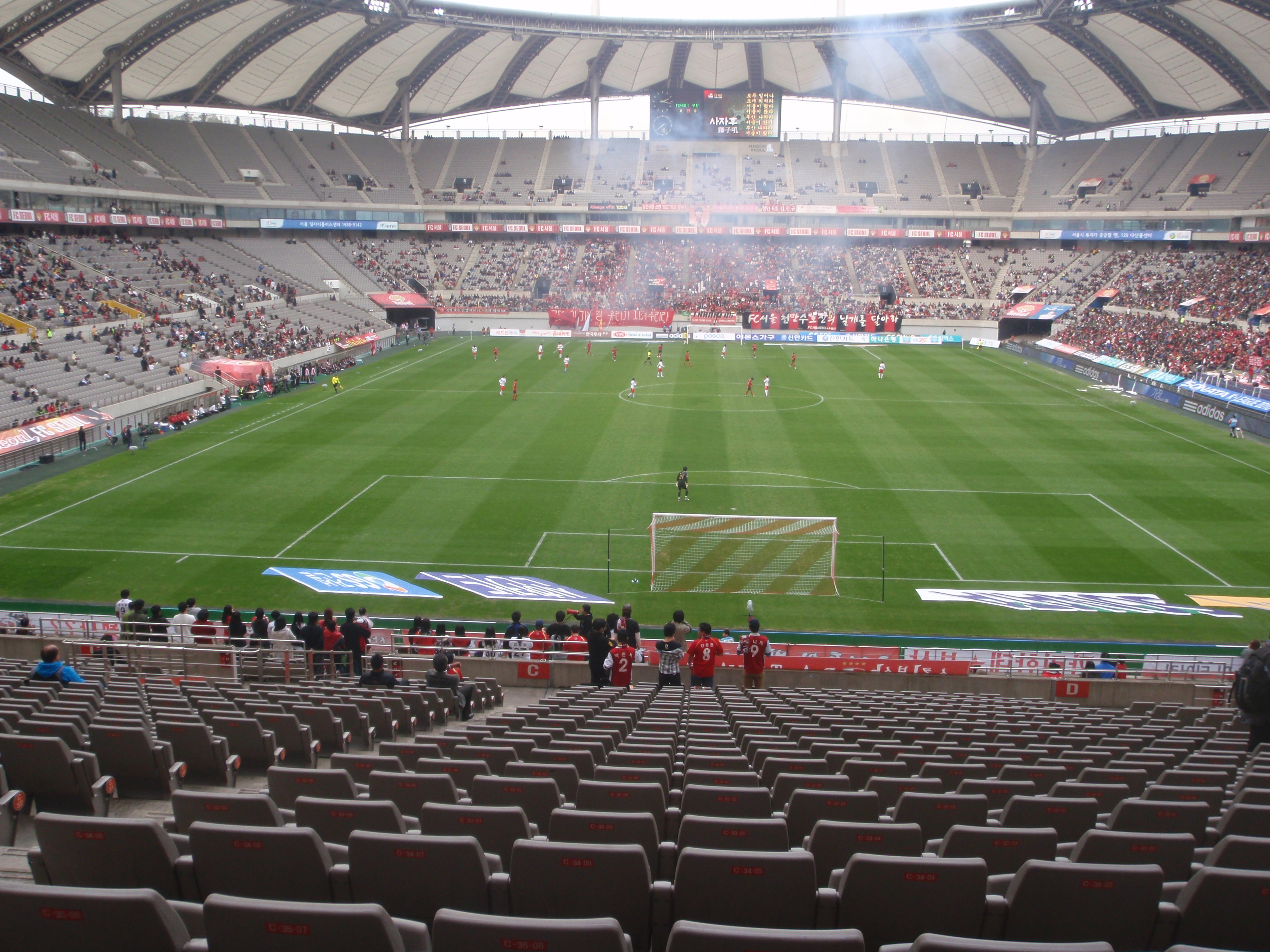 So, it’s taken a while, but eventually, the Seoul v Busan game. As we were hoping for Seoul to get beat we paid twelve thousand won to sit in the away end. At one point I thought we might be the only people behind that goal, but a few more Busan fans filtered in and sat near the front. I think it was probably the lowest crowd I’ve seen at a game in that ground and despite the attendance being officially stated at 28,000, I reckon that there were probably more like 8-10,000 there.