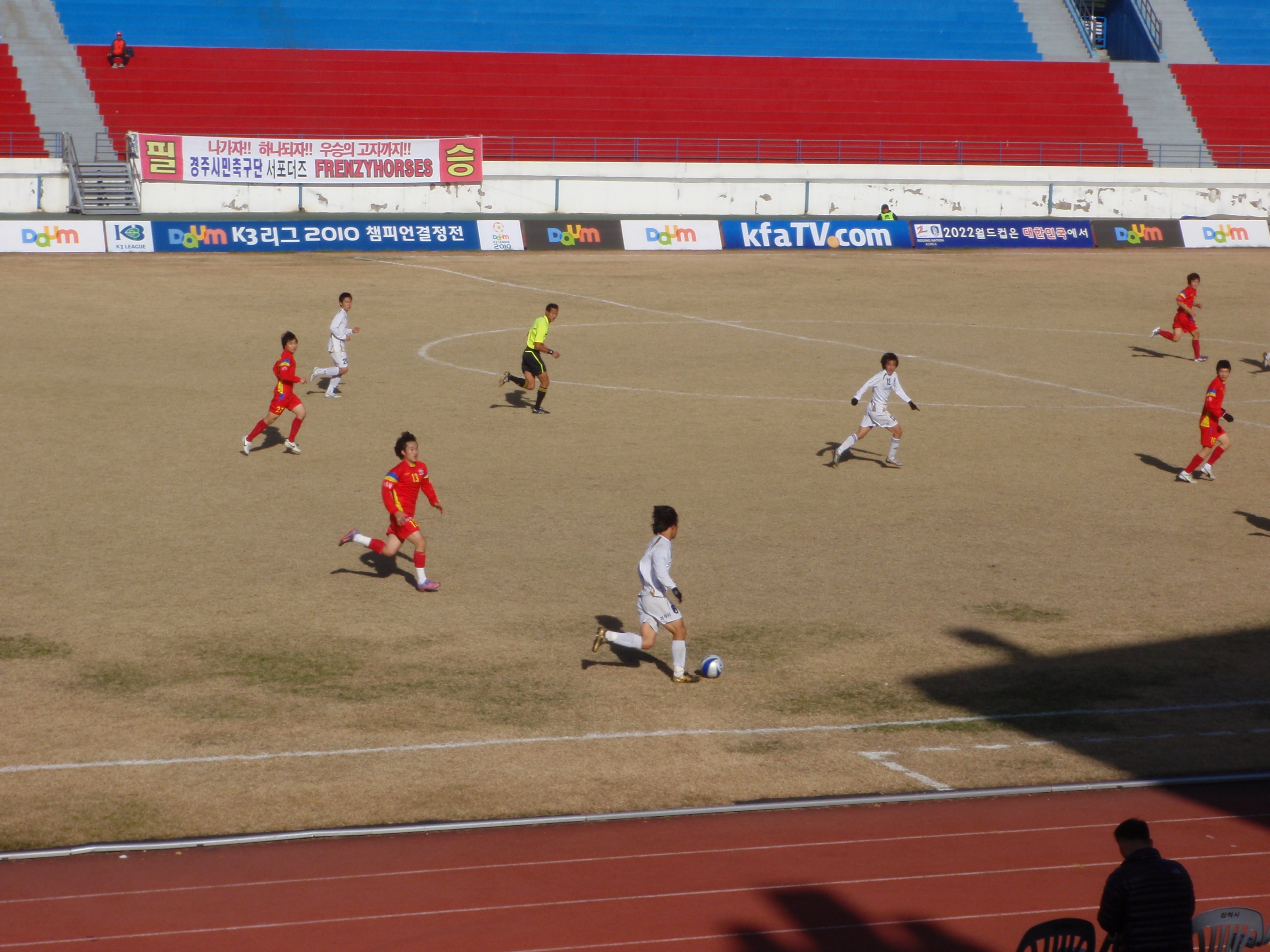 One of the teams was wearing a red strip, the other was in white. I had no idea which team was which and as the half went on I didn’t really get any wiser. I think that I was sat with the Samcheok fans, although as they weren’t wearing any colours and with most of them seeming to cheer everything that was going on regardless of who did it, I couldn’t be absolutely certain.