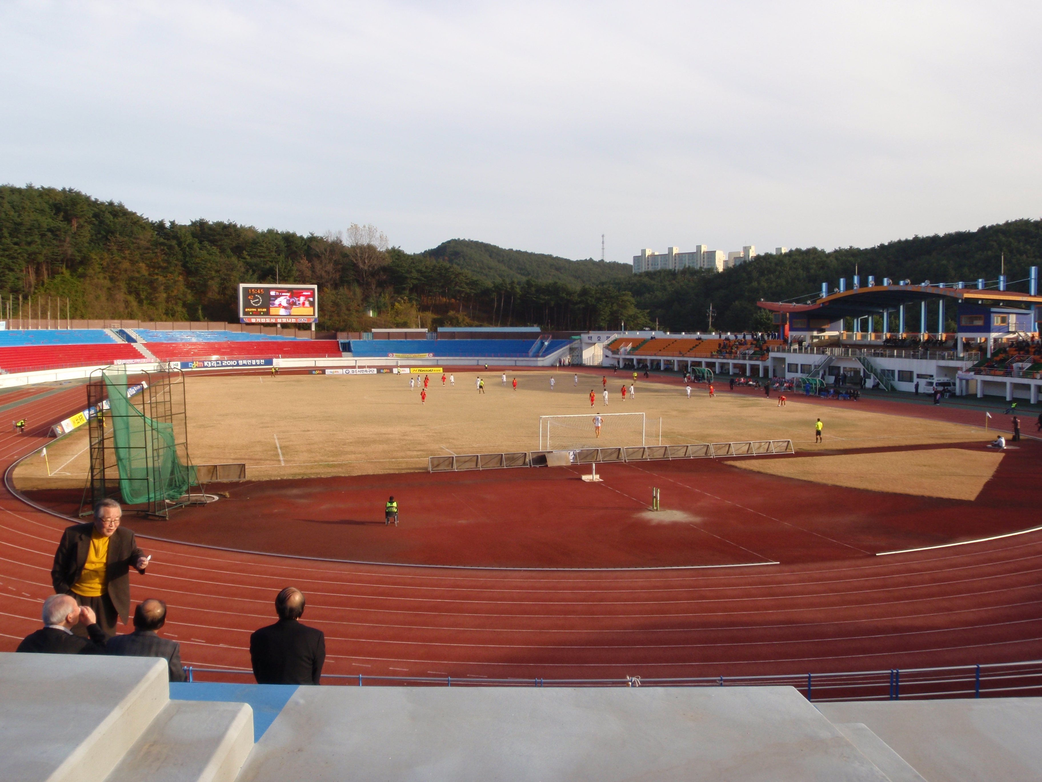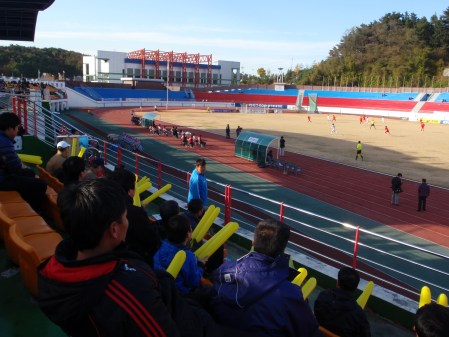 The stadium was quite typical of older Korean grounds. It was oval shaped, with a running track and with a small covered stand along part of one side. The remainder of the oval was uncovered terracing. Where it did differ from other places was the playing surface. It was grass, which isn’t too unusual, but it was yellow grass, which tends to be a bit rarer. Particularly as we are only a few weeks past an uncommonly lengthy rainy season.