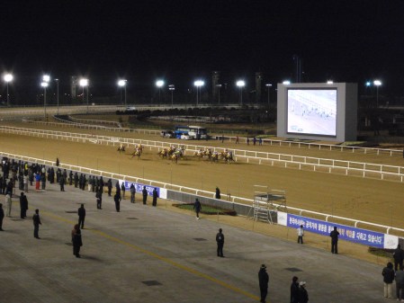 I got to watch a couple of races under floodlights too. It gets dark at about five-ish this time of year and although I hadn’t planned to stay until the end, the prospect of the floodlights kept me there a bit longer than I would have stayed if it had been light. I did ok with the betting too, with five wins from the eight races that I watched live and the three from Busan that were shown on the big screen.