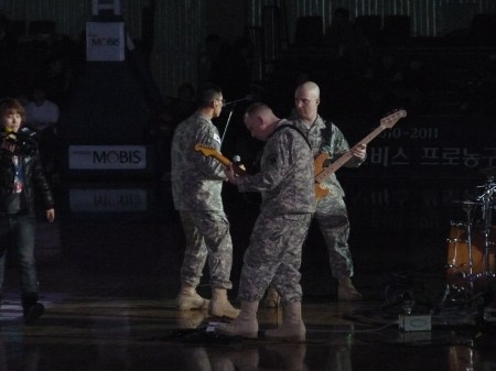 At the interval we got a couple of songs from some American soldiers with guitars. Whilst I’m sure that they did their best and seemed to enjoy themselves, they had even less in common with Mr Thunders than the basketball team did. I reckon that if they were sent to play at the De-Militarised Zone then Kim Jong-il would soon be calling it a day.  There wasn’t a bar that would have allowed me to pretend that they were the support act either. There wasn’t any beer at all actually, a major omission at a Korean sporting event if you ask me.