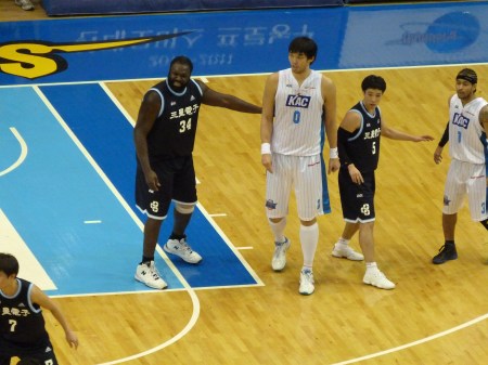 Both the first two quarters were fairly tight, Samsung edging the first 28-25 and then increasing their lead to 51-43 by the half time interval. The main point of interest was the KCC Egis centre Ha Seung Jin who, depending on your source of information, is either 7’3“ or 7’4“. I don‘t suppose that extra inch makes a lot of difference as to how often he cracks his head when going through a door.