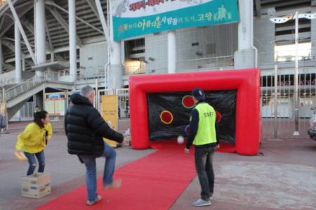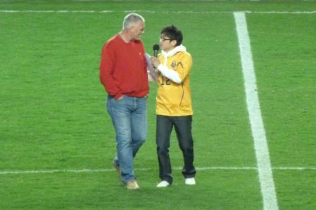The generous hospitality continued and we were given a football and then had our photograph taken by the official Goyang bloke with a Polaroid camera. I struggle to understand why the crowds are so low really. It seemed ideal for keeping the kids amused. A bloke can bring his kids for a free evening out, get their photo taken, let them run amok with a free football amongst the empty stands whilst he watches the match and then return home with a bag of assorted hair products to keep the missus sweet. Why wouldn’t you?