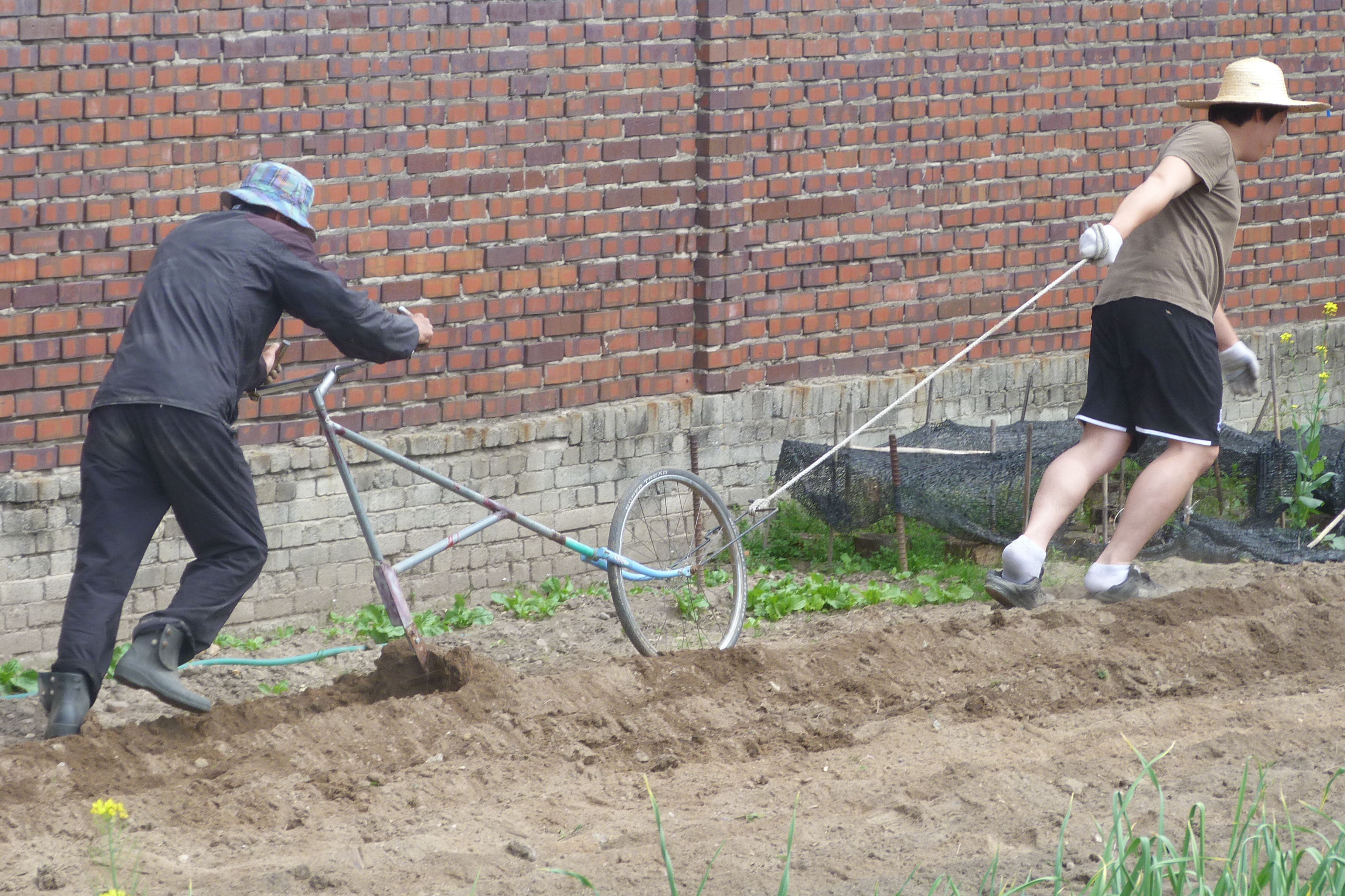 The walk to the stadium turned out to be forty minutes, so in reality we wouldn’t have even been able to stay for the kick-off if we’d been limited to the Seoul bus with empty seats. The highlight of the walk was passing a couple of blokes turning over the soil in their back garden by way of a plough that incorporated a bicycle wheel. Luckily I had my camera with me.