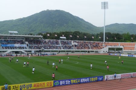 Sangju Sangmu are a new team in the K-League this season. Well, sort of. They are the team made up of players doing their national service and played in the past as Gwangju Sangmu. Gwangju was a bit of an odd place to base an Army team in bearing in mind the history of the uprising and subsequent massacre in 1980 and unsurprisingly the military didn’t have a great deal of support at their old stadium. The move to Sangju seems to have given them a new lease of life though and although it’s early days the locals appear to be very happy to have K-League football in their town.