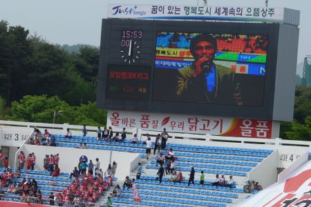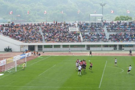 When we got inside the Sangju Civic Stadium it became apparent that it was a pretty decent ground. Okay, it had a running track and only the main stand was covered, but with a fifteen thousand capacity it was small enough not to seem deserted and there was a pleasant mountain backdrop. I’d estimate that there were about six thousand fans there, with a couple of hundred having made the trip from Seoul.