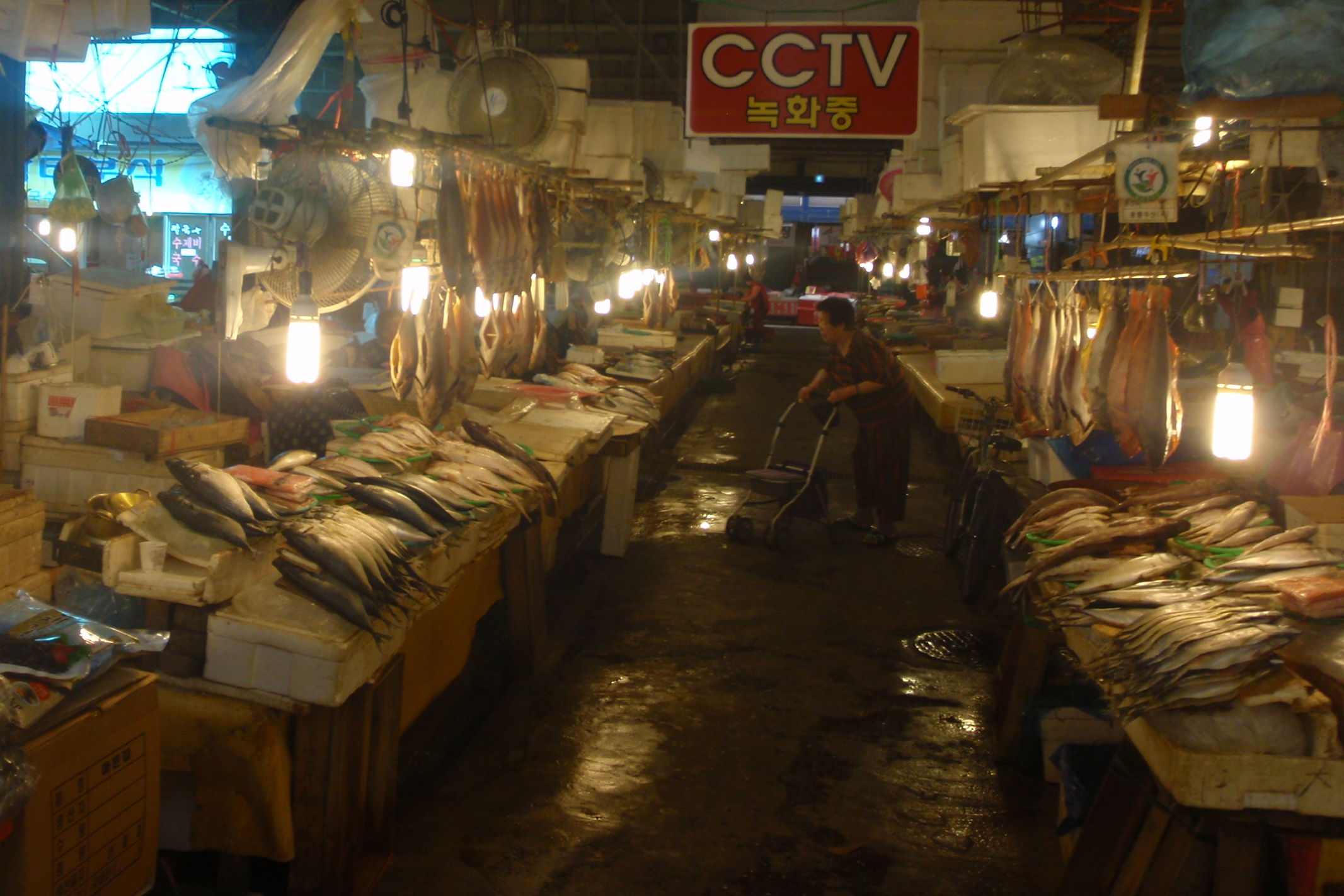 As it was, we got to Pohang just before noon. After a quick lunch of gimbap and kimchi mandu we had a wander along to the Jukdo Market.