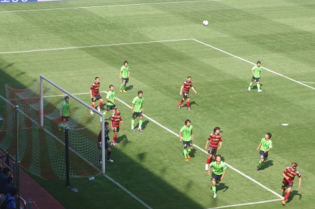 There weren’t many empty seats along the side and we ended up near the corner flag, quite close to the back. It was still a good view though, as the lack of a running track and the steep gradient in the stands meant that we were pretty near to the pitch. It’s probably the best designed of all the football stadiums that I’ve been to in Korea, appropriately sized with a 25,000 capacity and with a roof all of the way around. There was a section on the other side of the ground that was fully occupied by soldiers. They seemed to clap and cheer in time with each other, so perhaps it’s something that they cover in basic training.